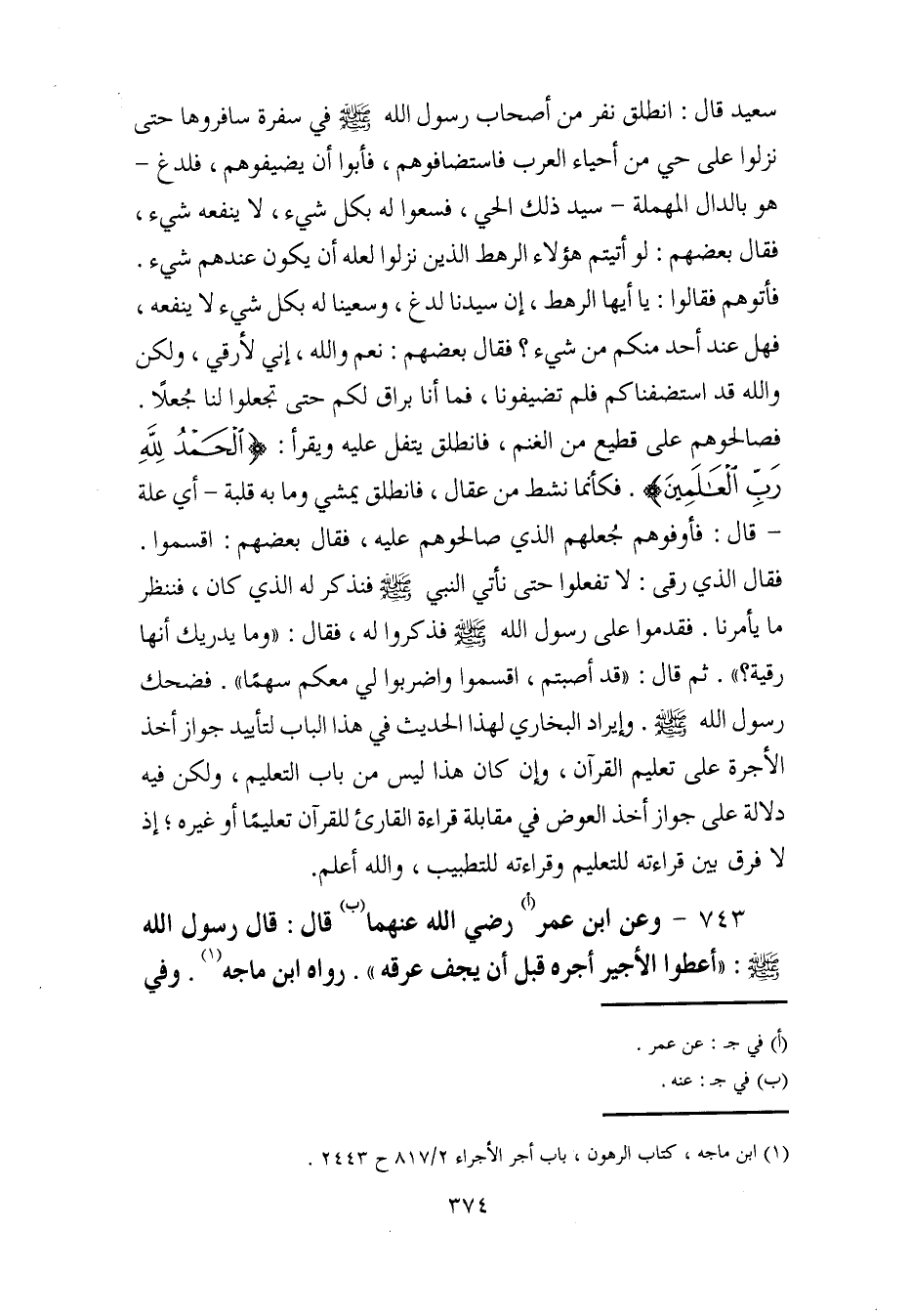 سعيد قال: انطلق نفر من أصحاب رسول الله - صلى الله عليه وسلم - في سفرة سافروها حتى نزلوا على حي من أحياء العرب فاستضافوهم، فأبوا أن يضيفوهم، فلدغ -هو بالدال المهملة- سيد ذلك الحي، فسعوا له بكل شيء، لا ينفعه شيء، فقال بعضهم: لو أتيتم هؤلاء الرهط الذين نزلوا لعله أن يكون عندهم شيء. فأتوهم فقالوا: يا أيها الرهط، إن سيدنا لدغ، وسعينا له بكل شيء لا ينفعه، فهل عند أحد منكم من شيء؟ فقال بعضهم: نعم والله، إني لأرقي، ولكن والله قد استضفناكم فلم تضيفونا، فما أنا براق لكم حتى تجعلوا لنا جُعلًا. فصالحوهم على قطع من الغنم، فانطلق يتفل عليه ويقرأ: {الْحَمْدُ لِلَّهِ رَبِّ الْعَالَمِينَ}. فكأنما نشمط من عقال، فانطلق يمشي وما به قلبة -أي علة- قال: فأوفوهم جُعلهم الذي صالحوهم عليه، فقال بعضهم: اقسموا. فقال الذي رقى: لا تفعلوا حتى نأتي النبي - صلى الله عليه وسلم - فنذكر له الذي كان، فننظر ما يأمرنا. فقدموا على رسول الله - صلى الله عليه وسلم - فذكروا له، فقال: "وما يدريك أنها رقية؟ ". ثم قال: "قد أصبتم، اقسموا واضربوا لي معكم سهمًا". فضحك رسول الله - صلى الله عليه وسلم -. وإيراد البخاري لهذا الحديث في هذا الباب لتأييد جواز أخذ الأجرة على تعليم القرآن، وإن كان هذا ليس من باب التعليم، ولكن فيه دلالة على جواز أخذ العوض في مقابلة قراءة القارئ للقرآن تعليمًا أو غيره؛ إذ لا فرق بين قراءته للتعليم وقراءته للتطبيب، والله أعلم.