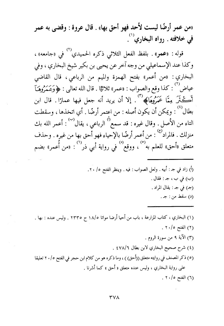 قوله: "عمر". بلفظ الفعل الثلاثي ذكره الحميدي (¬2) في "جامعه"، وكذا عند الإسماعيلي من وجه آخر عن يحيى بن بكير شيخ البخاري، وفي البخاري: "من أعمر" بفتح الهمزة والميم من الرباعي، قال القاضي عياض (2): كذا وقع والصواب: "عمر" ثلاثيًّا. قال الله تعالى: {وَعَمَرُوهَا أَكْثَرَ مِمَّا عَمَرُوهَا} (¬3). إلا أن يريد أنه جعل فيها عمارًا. قال ابن بطال (¬4): ويمكن أن يكون أصله: من اعتمر أرضًا. أي اتخذها، وسقطت التاء من الأصل. وقال غيره: قد سمع (أ) الرباعي، يقال (ب): أعمر الله بك منزلك. فالمراد (جـ): من أعمر أرضًا بالإحياء فهو أحق بها من غيره. وحذف متعلق "أحق" للعلم به (¬5)، ووقع (د) في رواية أبي ذر (¬6): "من أُعمر" بضم
