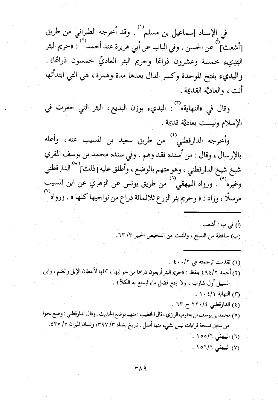 في الإسناد إسماعيل بن مسلم (¬1). وقد أخرجه الطبراني من طريق [أشعث] (أ) عن الحسن. وفي الباب عن أبي هريرة عند أحمد (¬2): "حريم البئر البَدِيء خمسة وعشرون ذراعًا وحريم البئر العاديِّ خمسون ذراعًا". والبديء بفتح الموحدة وكسر الدال بعدها مدة وهمزة، هي التي ابتدأتها أنت، والعاديَّة القديمة.