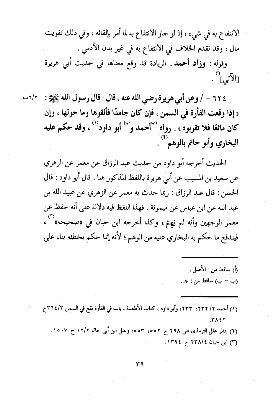624 - وعن أبي هريرة رضي الله عنه، قال: قال رسول الله - صلى الله عليه وسلم -: "إذا وقعت الفأرة في السمن، فإن كان جامدًا فألقوها وما حولها، وإن كان مائعًا فلا تقربوه". رواه (ب أحمد وب) أبو داود (¬1)، وقد حكم عليه البخاري وأبو حاتم بالوهم (¬2).