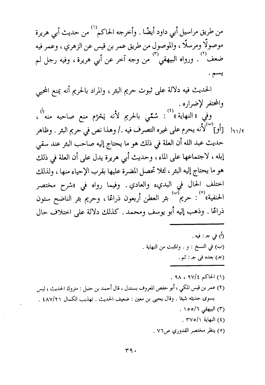 وفي "النهاية" (¬4): سُمِّي بالحريم لأنه يَحْرُم منع صاحبه منه (أ)، [أو] (ب) لأنه يحرم على غيره التصرف فيه. وهذا نص في حريم البئر. وظاهر حديث عبد الله أن العلة في ذلك هو ما يحتاج إليه صاحب البئر عند سقي إبله، لاجتماعها على الماء، وحديث أبي هريرة يدل على أن العلة في ذلك هو ما يحتاج إليه البئر، لئلا تحصل المضرة عليها بقرب الإحياء منها، ولذلك اختلف الحال في البديء والعادي. وفيما رواه في "شرح مختصر الحنفية" (¬5): حريم (ب) بئر العطن أربعون ذراعًا، وحريم بئر الناضح ستون ذراعًا. وذهب إليه أبو يوسف ومحمد. كذلك دلالة على اختلاف حال