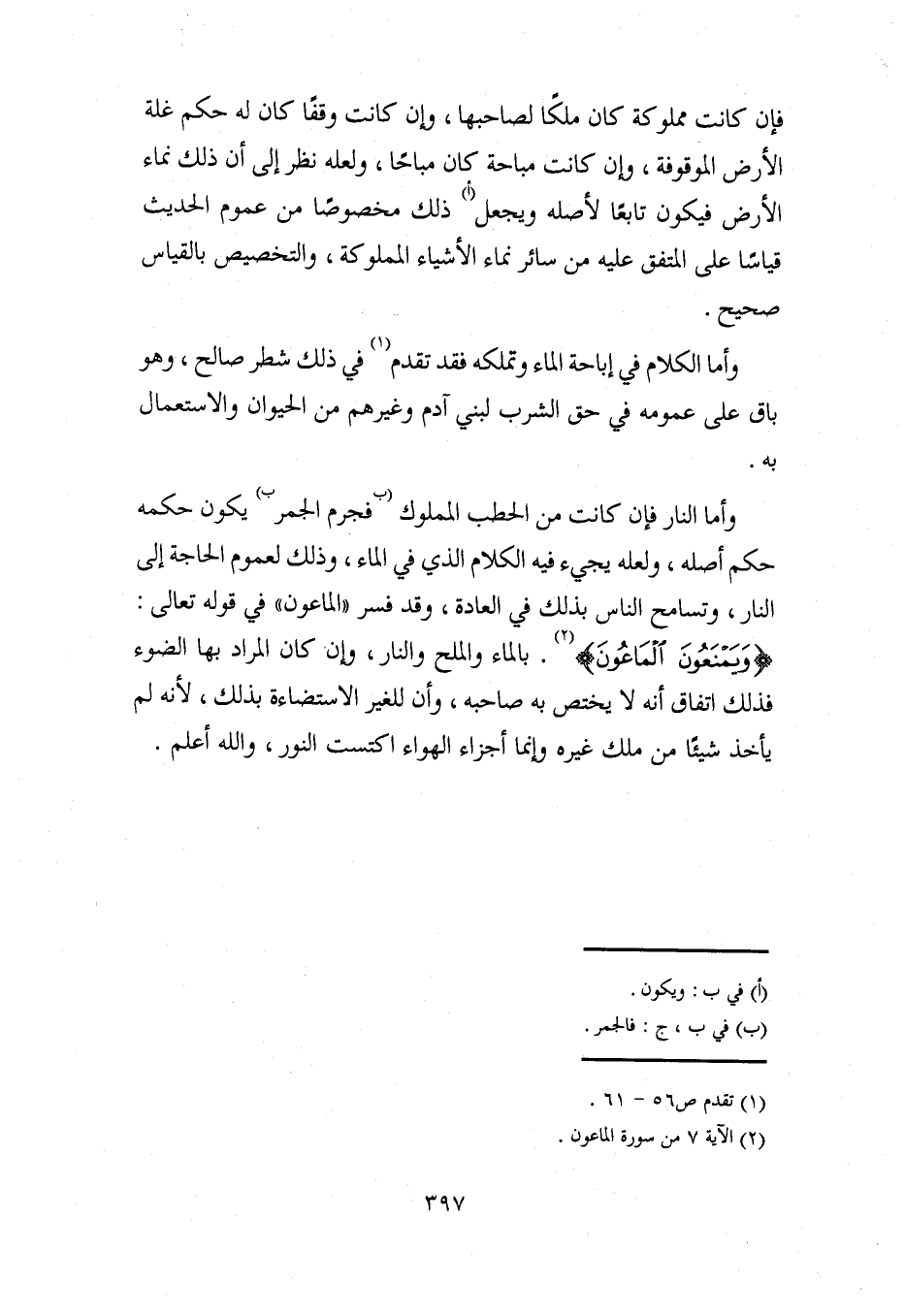 وأما النار فإن كانت من الحطب المملوك (ب فجرم الجمر ب) يكون حكمه حكم أصله، ولعله يجيء فيه الكلام الذي في الماء، وذلك لعموم الحاجة إلى النار، وتسامح الناس بذلك في العادة، وقد فسر "الماعون" في قوله تعالى: {وَيَمْنَعُونَ الْمَاعُونَ} (¬2). بالماء والملح والنار، وإن كان المراد بها الضوء فذلك اتفاق أنه لا يختص به صاحبه، وأن للغير الاستضاءة بذلك، لأنه لم يأخذ شيئًا من ملك غيره وإنما أجزاء الهواء اكتست النور، والله أعلم.