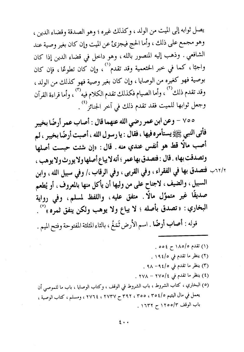 755 - وعن ابن عمر رضي الله عنهما قال: أصاب عمر أرضًا بخيبر فأتى النبي - صلى الله عليه وسلم - يستأمره فيها، فقال: يا رسول الله، أصبت أرضًا بخيبر، لم أصب مالًا قط هو أنفس عندي منه. قال: "إن شئت حبست أصلها وتصدقت بها". قال: فتصدق بها عمر؛ أنه لا يباع أصلها ولا يورث ولا يوهب، فتصدق بها في الفقراء، وفي القربى، وفي الرقاب، وفي سبيل الله، وابن السبيل، والضيف، لا جناح على من وليها أن يأكل منها بالمعروف، أو يُطعم صديقًا غير متموِّل مالًا. متفق عليه، واللفظ لمسلم، وفي رواية البخاري: "تصدق بأصله؛ لا يباع ولا يوهب ولكن ينفق ثمره" (¬5).