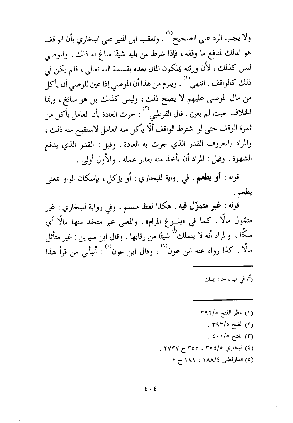 ولا يجب الرد على الصحيح (¬1). وتعقب ابن المنير على البخاري بأن الواقف هو المالك لمنافع ما وقفه، فإذا شرط لمن يليه شيئًا ساغ له ذلك، والموصي ليس كذلك، لأن ورثته يملكون المال بعده بقسمة الله تعالى، فلم يكن في ذلك كالواقف. انتهى (¬2). ويلزم من هذا أن الموصي إذا عين للوصي أن يأكل من مال الموصى عليهم لا يصح ذلك، وليس كذلك بل هو سائغ، وإنما الخلاف حيث لم يعين. قال القرطبي (¬3): جرت العادة بأن العامل يأكل من ثمرة الوقف حتى لو اشترط الواقف ألّا يأكل منه العامل لاستقبح منه ذلك، والمراد بالمعروف القدر الذي جرت به العادة. وقيل: القدر الذي يدفع الشهوة. وقيل: المراد أن يأخذ منه بقدر عمله. والأول أولى.