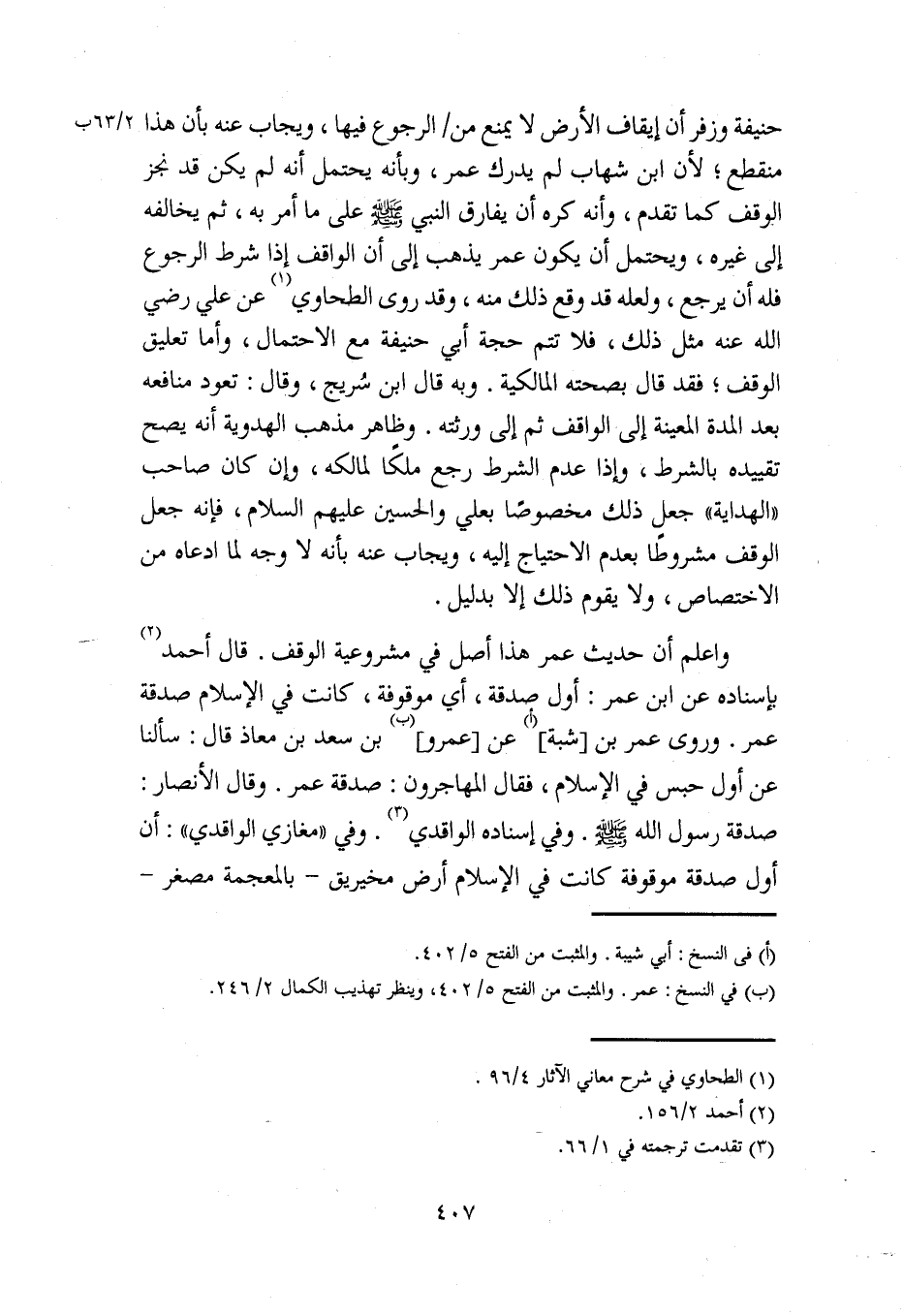 حنيفة وزفر أن إيقاف الأرض لا يمنع من الرجوع فيها، ويجاب عنه بأن هذا منقطع؛ لأن ابن شهاب لم يدرك عمر، وبأنه يحتمل أنه لم يكن قد نجز الوقف كما تقدم، وأنه كره أن يفارق النبي - صلى الله عليه وسلم - على ما أمر به، ثم يخالفه إلى غيره، ويحتمل أن يكون عمر يذهب إلى أن الواقف إذا شرط الرجوع فله أن يرجع، ولعله قد وقع ذلك منه، وقد روى الطحاوي (¬1) عن علي رضي الله عنه مثل ذلك، فلا تتم حجة أبي حنيفة مع الاحتمال، وأما تعليق الوقف؛ فقد قال بصحته المالكية. وبه قال ابن سُريج، وقال: تعود منافعه بعد المدة المعينة إلى الواقف ثم إلى ورثته. وظاهر مذهب الهدوية أنه يصح تقييده بالشرط، وإذا عدم الشرط رجع ملكًا لمالكه، وإن كان صاحب "الهداية" جعل ذلك مخصوصًا بعلي والحسين عليهم السلام، فإنه جعل الوقف مشروطًا بعدم الاحتياج إليه، ويجاب عنه بأنه لا وجه لما ادعاه من الاختصاص، ولا يقوم ذلك إلا بدليل.