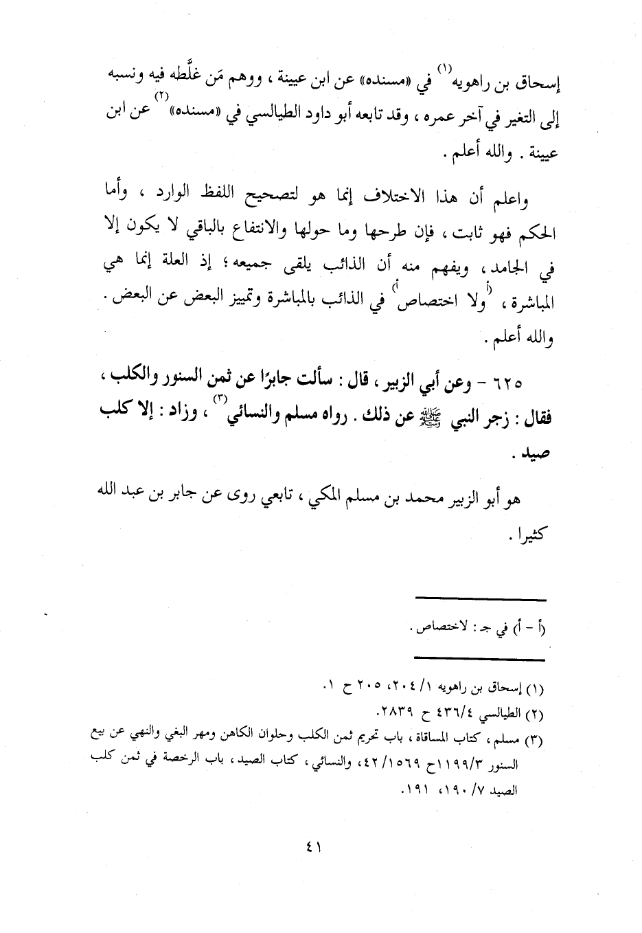 625 - وعن أبي الزبير، قال: سألت جابرًا عن ثمن السنور والكلب، فقال: زجر النبي - صلى الله عليه وسلم - عن ذلك. رواه مسلم والنسائي (¬3)، وزاد: إلا كلب صيد.