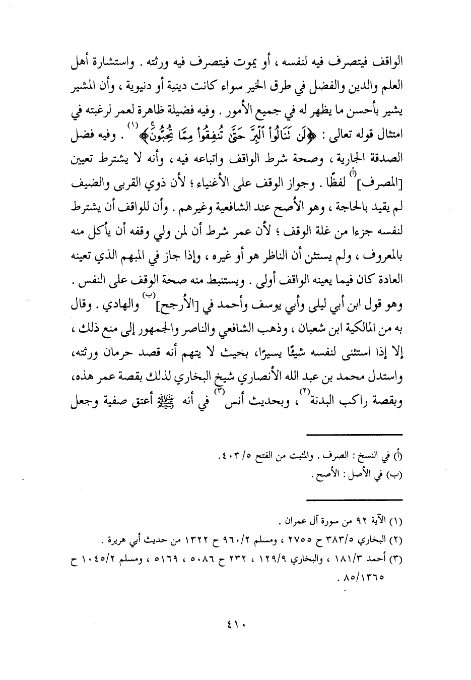 الواقف فيتصرف فيه لنفسه، أو يموت فيتصرف فيه ورثته. واستشارة أهل العلم والدين والفضل في طرق الخير سواء كانت دينية أو دنيوية، وأن المشير يشير بأحسن ما يظهر له في جميع الأمور. وفيه فضيلة ظاهرة لعمر لرغبته في امتثال قوله تعالى: {لَنْ تَنَالُوا الْبِرَّ حَتَّى تُنْفِقُوا مِمَّا تُحِبُّونَ} (¬1). وفيه فضل الصدقة الجارية، وصحة شرط الواقف واتباعه فيه، وأنه لا يشترط تعيين [المصرف] (أ) لفظًا. وجواز الوقف على الأغنياء؛ لأن ذوي القربى والضيف لم يقيد بالحاجة، وهو الأصح عند الشافعية وغيرهم. وأن للواقف أن يشترط لنفسه جزءًا من غلة الوقف؛ لأن عمر شرط أن لمن ولي وقفه أن يأكل منه بالمعروف، ولم يستثن أن الناظر هو أو غيره، وإذا جاز في المبهم الذي تعينه العادة كان فيما يعينه الواقف أولى. ويستنبط منه صحة الوقف على النفس. وهو قول ابن أبي ليلى وأبي يوسف وأحمد في [الأرجح] (5) والهادي. وقال به من المالكية ابن شعبان، وذهب الشافعي والناصر والجمهور إلى منع ذلك، إلا إذا استثنى لنفسه شيئًا يسيرًا، بحيث لا يتهم أنه قصد حرمان ورثته، واستدل محمد بن عبد الله الأنصاري شيخ البخاري لذلك بقصة عمر هذه، وبقصة راكب البدنة (¬2)، وبحديث أنس (¬3) في أنه - صلى الله عليه وسلم - أعتق صفية وجعل