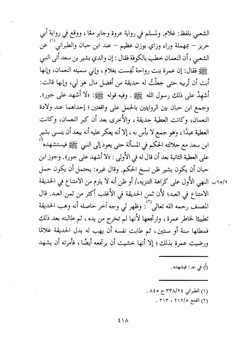 الشعبي بلفظ: غلام. ولمسلم في رواية عروة وجابر معًا، ووقع في رواية أبي حريز -بمهملة وراء وزاي بوزن عظيم- عند ابن حبان والطبراني (¬1) عن الشعبي، أن النعمان خطب بالكوفة فقال: إن والدي بشير بن سعد أتى النبي - صلى الله عليه وسلم - فقال: إن عمرة بنت رواحة نُفِست بغلام، وإني سميته النعمان، وإنها أبت أن تُربيه حتى جعلْتُ له حديقة من أفضل مال هو لي، وإنها قالت: أشهِدْ على ذلك رسول الله - صلى الله عليه وسلم -. وفيه قوله - صلى الله عليه وسلم -: "لا أشهد على جور". وجمع ابن حبان بين الروايتين بالحمل على واقعتين؛ إحداهما عند ولادة النعمان، وكانت العطية حديقة، والأخرى بعد أن كبر النعمان، وكانت العطية عبدًا، وهو جمع لا بأس به، إلا أنه يعكر عليه أنه يبعد أن ينسى بشير بن سعد مع جلالته الحكم في المسألة حتى يعود إلى النبي - صلى الله عليه وسلم - فيستشهده (أ) على العطية الثانية بعد أن قال له في الأولى: "لا أشهد على جور". وجوز ابن حبان أن يكون بشير ظن نسخ الحكم. وقال غيره: يحتمل أن يكون حمل النهي الأول على كراهة التنزيه، أو ظن أنه لا يلزم من الامتناع في الحديقة الامتناع في العبد؛ لأن ثمن الحديقة في الأغلب أكثر من ثمن العبد. قال المصنف رحمه الله تعالى (¬2): وظهر لي وجه آخر حاصله أنه وهب الحديقة تطييبًا لخاطر عمرة، وارتجعها لأنها لم تخرج من يده، ثم طالبته بعد ذلك فمطلها سنة أو سنتين، ثم طابت نفسه أن يهب له بدل الحديقة غلامًا ورضيت عمرة بذلك؛ إلا أنها خشيت أن يرتجعه أيضًا، فأمرته أن يشهد