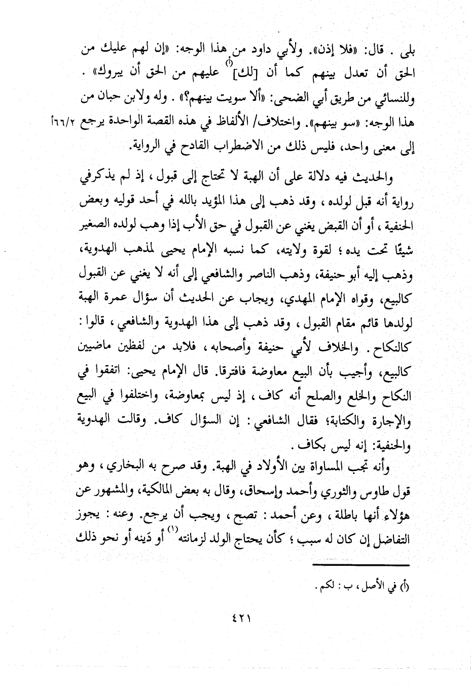 وأنه تجب المساواة بين الأولاد في الهبة. وقد صرح به البخاري، وهو قول طاوس والثوري وأحمد وإسحاق، وقال به بعض المالكية، والشهور عن هؤلاء أنها باطلة، وعن أحمد: تصح، ويجب أن يرجع. وعنه: يجوز التفاضل إن كان له سبب؛ كأن يحتاج