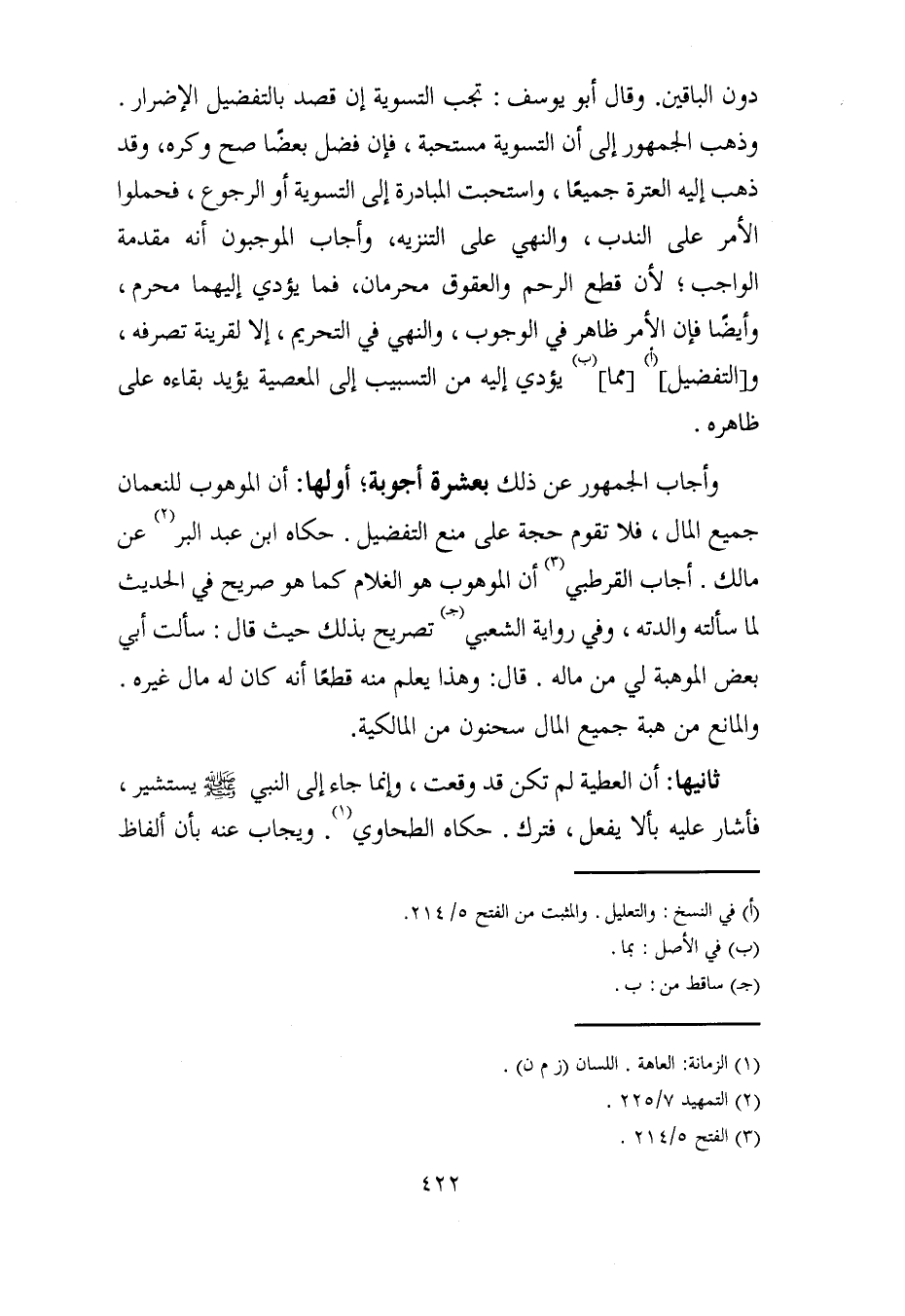 وأجاب الجمهور عن ذلك بعشرة أجوبة؛ أولها: أن الموهوب للنعمان جميع المال، فلا تقوم حجة على منع التفضيل. حكاه ابن عبد البر (¬2) عن مالك. أجاب القرطبي (¬3) أن الموهوب هو الغلام كما هو صريح في الحديث لما سألته والدته، وفي رواية الشعبي (جـ) تصريح بذلك حيث قال: سألت أبي بعض الموهبة لي من ماله. قال: وهذا يعلم منه قطعًا أنه كان له مال غيره. والمانع من هبة جميع المال سحنون من المالكية.