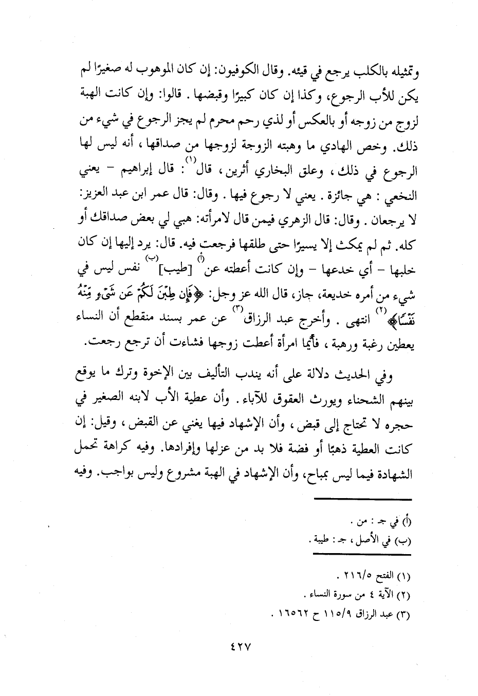 وتمثيله بالكلب يرجع في قيئه. وقال الكوفيون: إن كان الموهوب له صغيرًا لم يكن للأب الرجوع، وكذا إن كان كبيرًا وقبضها. قالوا: وإن كانت الهبة لزوج من زوجه أو بالعكس أو لذي رحم محرم لم يجز الرجوع في شيء من ذلك. وخص الهادي ما وهبته الزوجة لزوجها من صداقها، أنه ليس لها الرجوع في ذلك، وعلق البخاري أثرين، قال (¬1): قال إبراهيم -يعني النخعي: هي جائزة. يعني لا رجوع فيها. وقال: قال عمر ابن عبد العزيز: لا يرجعان. وقال: قال الزهري فيمن قال لامرأته: هبي لي بعض صداقك أو كله. ثم لم يمكث إلا يسيرًا حتى طلقها فرجعت فيه. قال: يرد إليها إن كان خلبها -أي خدعها- وإن كانت أعطته عن (أ) [طيب] (ب) نفس ليس في شيء من أمره خديعة، جاز، قال الله عزَّ وجلَّ: {فَإِنْ طِبْنَ لَكُمْ عَنْ شَيْءٍ مِنْهُ نَفْسًا} (¬2) انتهى. وأخرج عبد الرزاق (¬3) عن عمر بسند منقطع أن النساء يعطين رغبة ورهبة، فأيَّما امرأة أعطت زوجها فشاءت أن ترجع رجعت.