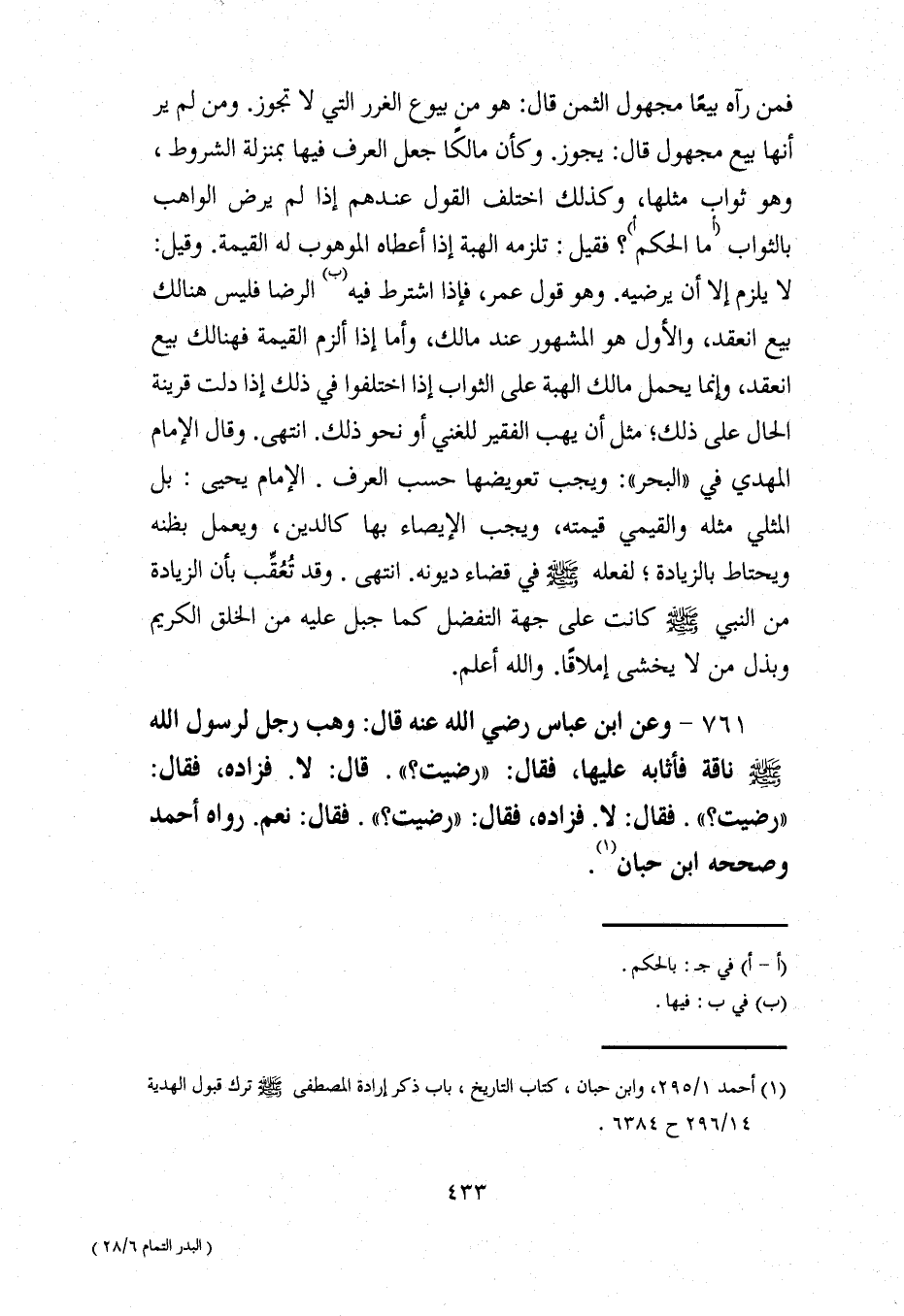 فمن رآه بيعًا مجهول الثمن قال: هو من بيوع الغرر التي لا تجوز. ومن لم ير أنها بيع مجهول قال: يجوز. وكأن مالكًا جعل العرف فيها بمنزلة الشروط، وهو ثواب مثلها، وكذلك اختلف القول عندهم إذا لم يرض الواهب بالثواب (أما الحكم أ)؟ فقيل: تلزمه الهبة إذا أعطاه الموهوب له القيمة. وقيل: لا يلزم إلا أن يرضيه. وهو قول عمر، فإذا اشترط فيه (5) الرضا فليس هنالك بيع انعقد، والأول هو المشهور عند مالك، وأما إذا ألزم القيمة فهنالك بيع انعقد، وإنما يحمل مالك الهبة على الثواب إذا اختلفوا في ذلك إذا دلت قرينة الحال على ذلك؛ مثل أن يهب الفقير للغني أو نحو ذلك. انتهى. وقال الإمام المهدي في "البحر": ويجب تعويضها حسب العرف. الإمام يحيى: بل المثلي مثله والقيمي قيمته، ويجب الإيصاء بها كالدين، ويعمل بظه ويحتاط بالزيادة؛ لفعله - صلى الله عليه وسلم - في قضاء ديونه. انتهى. وقد تُعُقِّب بأن الزيادة من النبي - صلى الله عليه وسلم - كانت على جهة التفضل كما جبل عليه من الخلق الكريم وبذل من لا يخشى إملاقًا. والله أعلم.