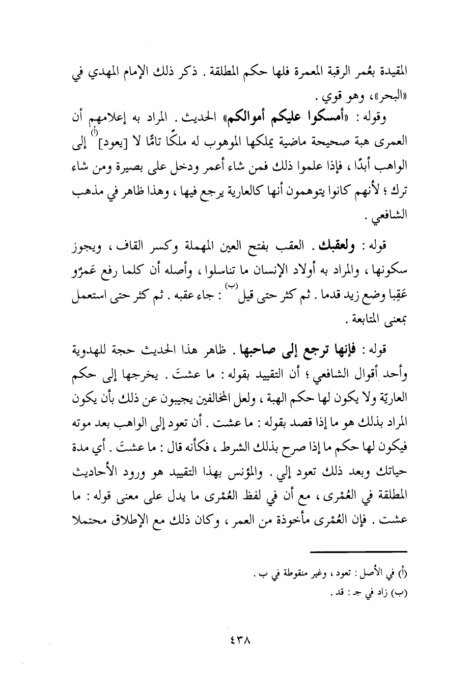 قوله: فإنها ترجع إلى صاحبها. ظاهر هذا الحديث حجة للهدوية وأحد أقوال الشافعي؛ أن التقييد بقوله: ما عشتَ. يخرجها إلى حكم العاريّة ولا يكون لها حكم الهبة، ولعل المخالفين يجيبون عن ذلك بأن يكون المراد بذلك هو ما إذا قصد بقوله: ما عشت. أن تعود إلى الواهب بعد موته فيكون لها حكم ما إذا صرح بذلك الشرط، فكأنه قال: ما عشتَ. أي مدة حياتك وبعد ذلك تعود إلي. والمؤنس بهذا التقييد هو ورود الأحاديث المطلقة في العُمْرى، مع أن في لفظ العُمْرى ما يدل على معنى قوله: ما عشت. فإن العُمْرى مأخوذة من العمر، وكان ذلك مع الإطلاق محتملا