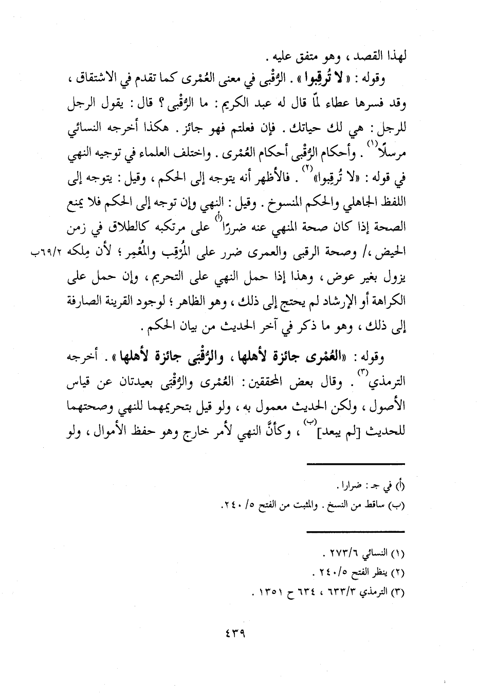 وقوله: "العُمْرى جائزة لأهلها، والرُّقْبَى جائزة لأهلها". أخرجه الترمذي (¬3). وقال بعض المحققين: العُمْرى والرُّقْبَى بعيدتان عن قياس الأصول، ولكن الحديث معمول به، ولو قيل بتحريمهما للنهي وصحتهما للحديث [لم يبعد] (ب)، وكأنَّ النهي لأمر خارج وهو حفظ الأموال، ولو