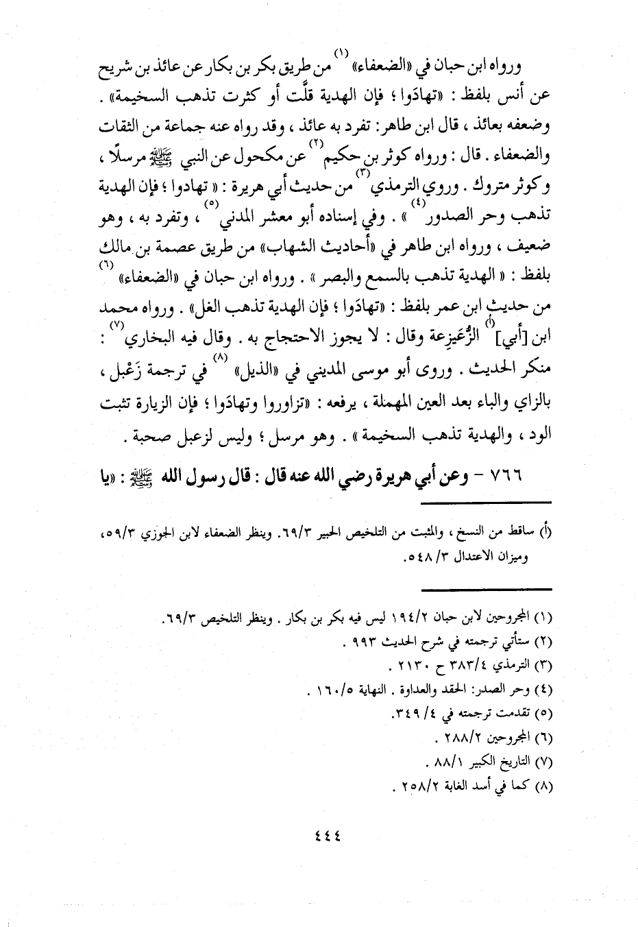 ورواه ابن حبان في "الضعفاء" (¬1) من طريق بكر بن بكار عن عائذ بن شريح عن أنس بلفظ: "تهادَوا؛ فإن الهدية قلَّت أو كثرت تذهب السخيمة". وضعفه بعائذ، قال ابن طاهر: تفرد به عائذ، وقد رواه عنه جماعة من الثقات والضعفاء. قال: ورواه كوثر بن حكيم (¬2) عن مكحول عن النبي - صلى الله عليه وسلم - مرسلًا، وكوثر متروك. وروي الترمذي (¬3) من حديث أبي هريرة: "تهادوا؛ فإن الهدية تذهب وحر الصدور (¬4) ". وفي إسناده أبو معشر المدني (¬5)، وتفرد به، وهو ضعيف، ورواه ابن طاهر في "أحاديث الشهاب" من طريق عصمة بن مالك بلفظ: "الهدية تذهب بالسمع والبصر". ورواه ابن حبان في "الضعفاء" (¬6) من حديث ابن عمر بلفظ: "تهادَوا؛ فإن الهدية تذهب الغل". ورواه محمد ابن [أبي] (أ) الزُّعَيزِعة وقال: لا يجوز الاحتجاج به. وقال فيه البخاري (¬7): منكَر الحديث. وروى أبو موسى المديني في "الذيل" (¬8) في ترجمة زَعْبل، بالزاي والباء بعد العين المهفلة، يرفعه: "تزاوروا وتهادَوا؛ فإن الزيارة تثبت الود، والهدية تذهب السخيمة". وهو مرسل؛ وليس لزعبل صحبة.
