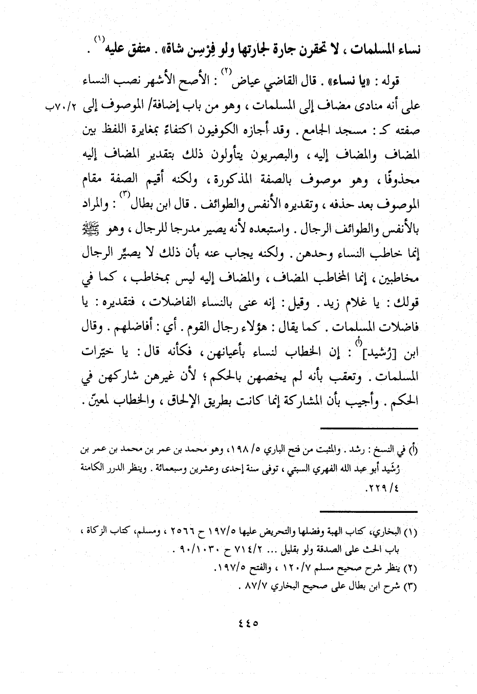 قوله: "يا نساء". قال القاضي عياض (¬2): الأصح الأشهر نصب النساء على أنه منادى مضاف إلى المسلمات، وهو من باب إضافة الموصوف إلى صفته كـ: مسجد الجامع. وقد أجازه الكوفيون اكتفاءً بمغايرة اللفظ بين المضاف والمضاف إليه، والبصريون يتأولون ذلك بتقدير المضاف إليه محذوفًا، وهو موصوف بالصفة المذكورة، ولكنه أقيم الصفة مقام الموصوف بعد حذفه، وتقديره الأنفس والطوائف. قال ابن بطال (¬3): والمراد بالأنفس والطوائف الرجال. واستبعده لأنه يصير مدرجا للرجال، وهو - صلى الله عليه وسلم - إنما خاطب النساء وحدهن. ولكنه يجاب عنه بأن ذلك لا يصيِّر الرجال مخاطبين، إنما المخاطب المضاف، والمضاف إليه ليس بمخاطب، كما في قولك: يا غلام زيد. وقيل: إنه عنى بالنساء الفاضلات، فتقديره: يا فاضلات المسلمات. كما يقال: هؤلاء رجال القوم. أي: أفاضلهم. وقال ابن [رُشيد] (أ): إن الخطاب لنساء بأعيانهن، فكأنه قال: يا خيّرات المسلمات. وتعقب بأنه لم يخصهن بالحكم؛ لأن غيرهن شاركهن في الحكم. وأجيب بأن المشاركة إنما كانت بطريق الإلحاق، والخطاب لمعيّن.
