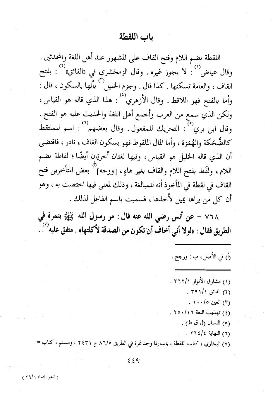 768 - عن أنس رضي الله عنه قال: مر رسول الله - صلى الله عليه وسلم - بتمرة في الطريق فقال: "لولا أني أخاف أن تكون من الصدقة لأكلتها". متفق عليه (¬7).