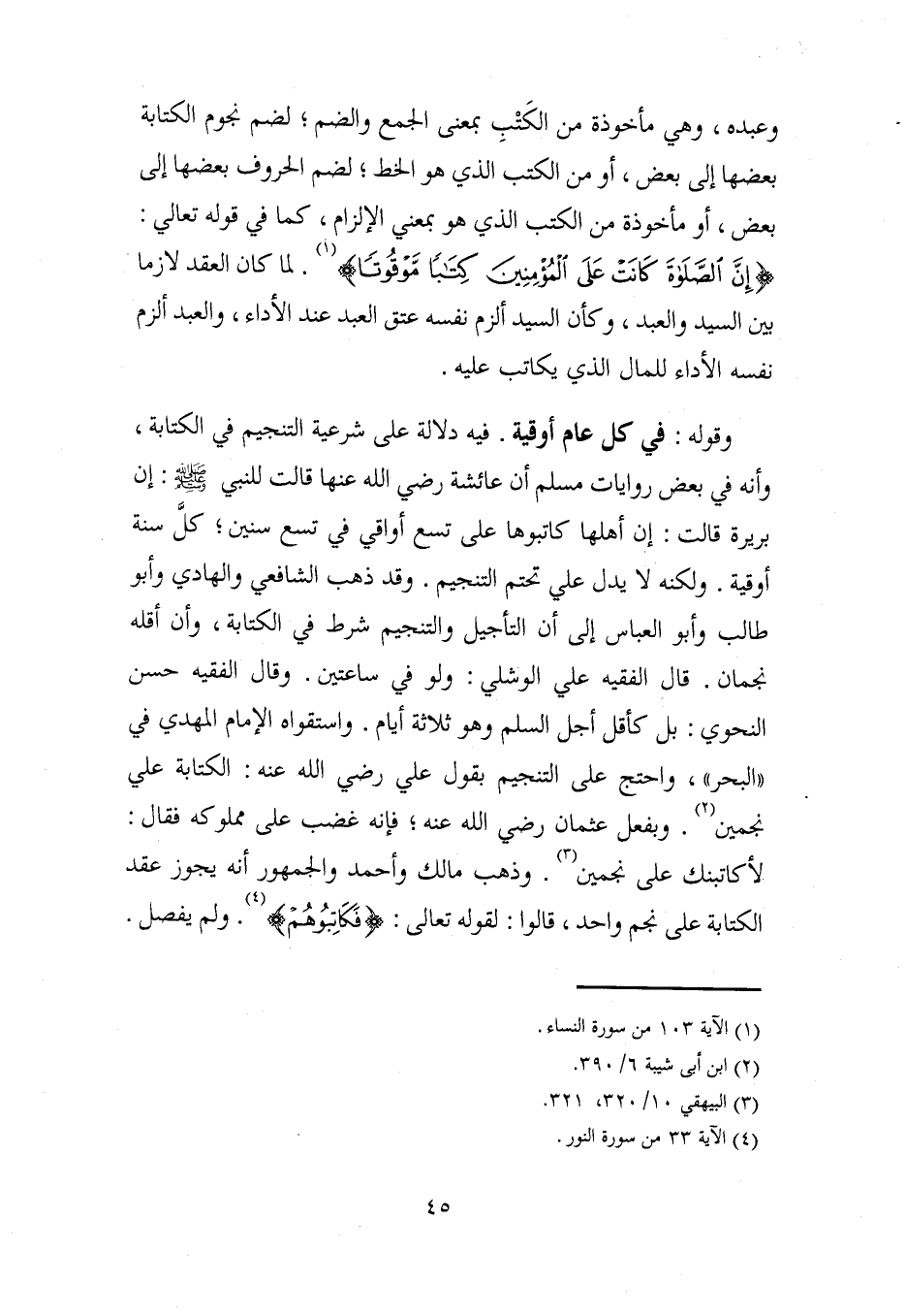 وعبده، وهي مأخوذة من الكَتْبِ بمعنى الجمع والضم، لضم نجوم الكتابة بعضها إلى بعض، أو من الكتب الذي هو الخط، لضم الحروف بعضها إلى بعض، أو مأخوذة من الكتب الذي هو بمعنى الإلزام، كما في قوله تعالى: {إِنَّ الصَّلَاةَ كَانَتْ عَلَى الْمُؤْمِنِينَ كِتَابًا مَوْقُوتًا} (¬1). لما كان العقد لازما بين السيد والعبد، وكأن السيد ألزم نفسه عتق العبد عند الأداء، والعبد ألزم نفسه الأداء للمال الذي يكاتب عليه.