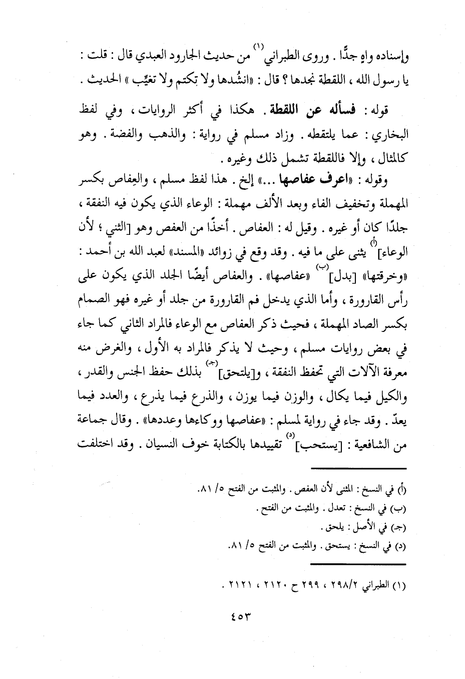 وقوله: "اعرف عفاصها ... " إلخ. هذا لفظ مسلم، والعِفاص بكسر المهملة وتخفيف الفاء وبعد الألف مهملة: الوعاء الذي يكون فيه النفقة، جلدًا كان أو غيره. وقيل له: العفاص. أخذًا من العفص وهو [الثني؛ لأن الوعاء] (أ) يثنى على ما فيه. وقد وقع في زوائد "المسند" لعبد الله بن أحمد: "وخرقتها" [بدل] (5) "عفاصها". والعفاص أيضًا الجلد الذي يكون على رأس القارورة، وأما الذي يدخل فم القارورة من جلد أو غيره فهو الصمام بكسر الصاد المهملة، فحيث ذكر العفاص مع الوعاء فالمراد الثاني كما جاء في بعض روايات مسلم، وحيث لا يذكر فالمراد به الأول، والغرض منه معرفة الآلات التي تحفظ النفقة، و [يلتحق] (جـ) بذلك حفظ الجنس والقدر، والكيل فيما يكال، والوزن فيما يوزن، والذرع فيما يذرع، والعدد فيما يعدّ. وقد جاء في رواية لمسلم: "عفاصها ووكاءها وعددها". وقال جماعة من الشافعية: [يستحب] (د) تقييدها بالكتابة خوف النسيان. وقد اختلفت