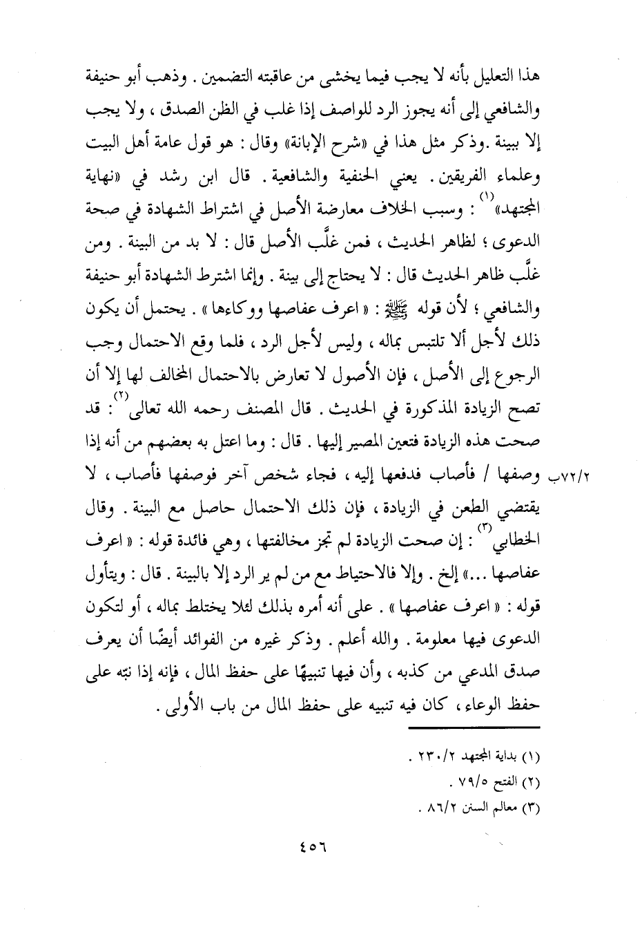 هذا التعليل بأنه لا يجب فيما يخشى من عاقبته التضمين. وذهب أبو حنيفة والشافعي إلى أنه يجوز الرد للواصف إذا غلب في الظن الصدق، ولا يجب إلا ببينة. وذكر مثل هذا في "شرح الإبانة" وقال: هو قول عامة أهل البيت وعلماء الفريقين. يعني الحنفية والشافعية. قال ابن رشد في "نهاية المجتهد" (¬1): وسبب الخلاف معارضة الأصل في اشتراط الشهادة في صحة الدعوى؛ لظاهر الحديث، فمن غلَّب الأصل قال: لا بد من البينة. ومن غلَّب ظاهر الحديث قال: لا يحتاج إلى بينة. وإنما اشترط الشهادة أبو حنيفة والشافعي؛ لأن قوله - صلى الله عليه وسلم -: "اعرف عفاصها ووكاءها". يحتمل أن يكون ذلك لأجل ألا تلتبس بماله، وليس لأجل الرد، فلما وقع الاحتمال وجب الرجوع إلى الأصل، فإن الأصول لا تعارض بالاحتمال المخالف لها إلا أن تصح الزيادة المذكورة في الحديث. قال المصنف رحمه الله تعالى (¬2): قد صحت هذه الزيادة فتعين المصير إليها. قال: وما اعتل به بعضهم من أنه إذا وصفها فأصاب فدفعها إليه، فجاء شخص آخر فوصفها فأصاب، لا يقتضي الطعن في الزيادة، فإن ذلك الاحتمال حاصل مع البينة. وقال الخطابي (¬3): إن صحت الزيادة لم تجز مخالفتها، وهي فائدة قوله: "اعرف عفاصها ... " إلخ. وإلا فالاحتياط مع من لم ير الرد إلا بالبينة. قال: ويتأول قوله: "اعرف عفاصها". على أنه أمره بذلك لئلا يختلط بماله، أو لتكون الدعوى فيها معلومة. والله أعلم. وذكر غيره من الفوائد أيضًا أن يعرف صدق المدعي من كذبه، وأن فيها تنبيهًا على حفظ المال، فإنه إذا نبّه على حفظ الوعاء، كان فيه تنبيه على حفظ المال من باب الأولى.
