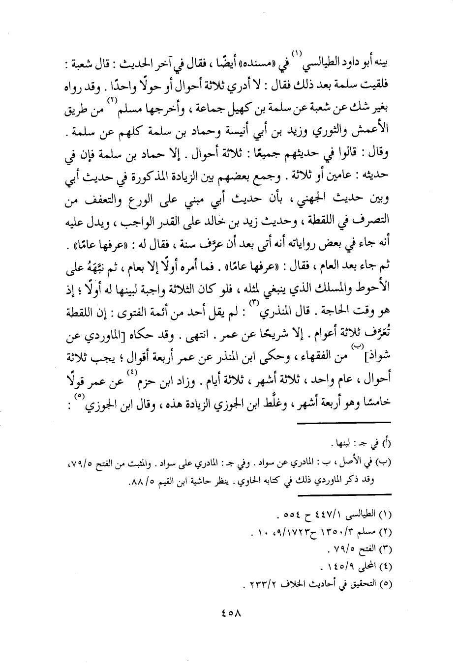 بينه أبو داود الطيالسي (¬1) في "مسنده" أيضًا، فقال في آخر الحديث: قال شعبة: فلقيت سلمة بعد ذلك فقال: لا أدري ثلاثة أحوال أو حولًا واحدًا. وقد رواه بغير شك عن شعبة عن سلمة بن كهيل جماعة، وأخرجها مسلم (¬2) من طريق الأعمش والثوري وزيد بن أبي أنيسة وحماد بن سلمة كلهم عن سلمة. وقال: قالوا في حديثهم جميعًا: ثلاثة أحوال. إلا حماد بن سلمة فإن في حديثه: عامين أو ثلاثة. وجمع بعضهم بين الزيادة المذكورة في حديث أبي وبين حديث الجهني، بأن حديث أبي مبني على الورع والتعفف من التصرف في اللقطة، وحديث زيد بن خالد على القدر الواجب، ويدل عليه أنَّه جاء في بعض رواياته أنَّه أتى بعد أن عرَّف سنة، فقال له: "عرفها عامًا". ثم جاء بعد العام، فقال: "عرفها عامًا". فما أمره أولًا إلا بعام، ثم نبَّهَهُ على الأحوط والمسلك الَّذي ينبغي لمثله، فلو كان الثلاثة واجبة لبينها له أولًا؛ إذ هو وقت الحاجة. قال المنذري (¬3): لم يقل أحد من أئمة الفتوى: إن اللقطة تُعَرَّف ثلاثة أعوام. إلا شريحًا عن عمر. انتهى. وقد حكاه [الماوردي عن شواذ] (ب) من الفقهاء، وحكى ابن المنذر عن عمر أربعة أقوال؛ يجب ثلاثة أحوال، عام واحد، ثلاثة أشهر، ثلاثة أيام. وزاد ابن حزم (¬4) عن عمر قولًا خامسًا وهو أربعة أشهر، وغلَّط ابن الجوزي الزيادة هذه، وقال ابن الجوزي (¬5):