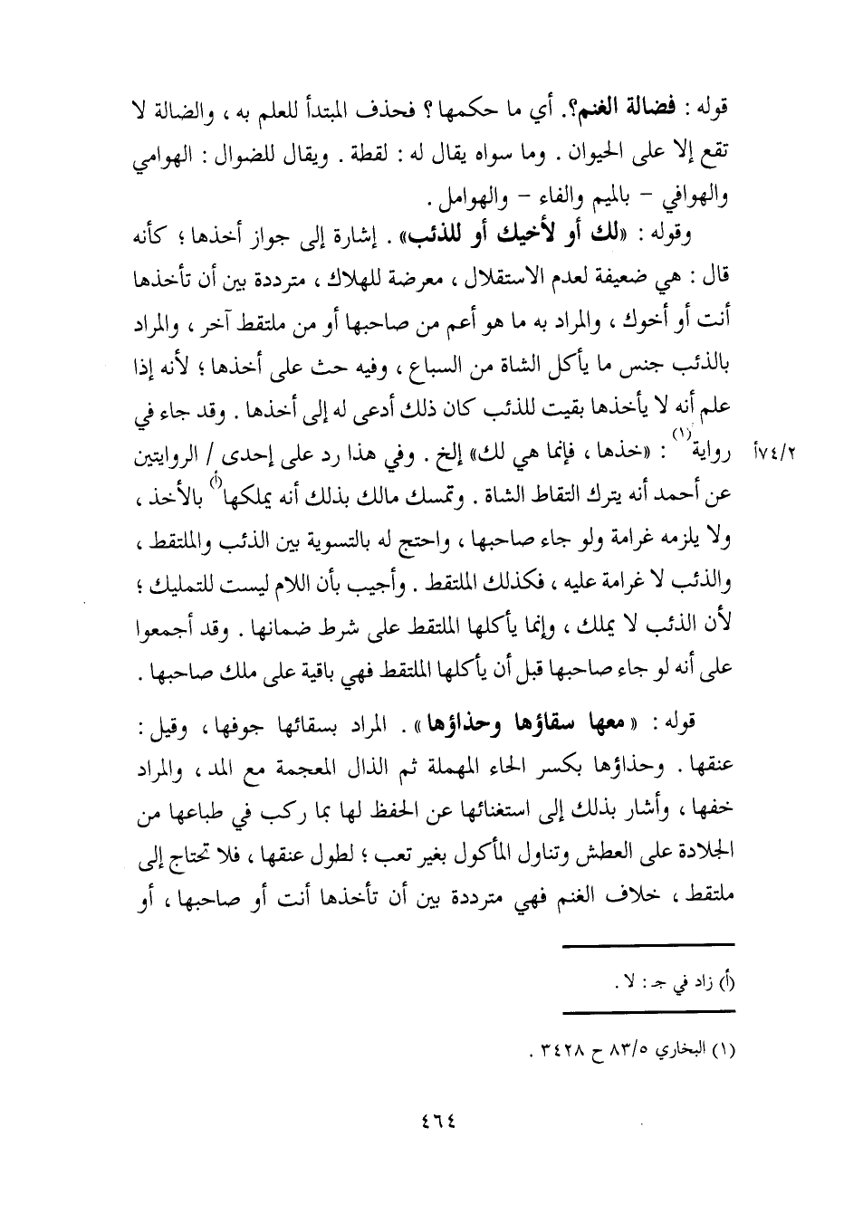 قوله: "معها سقاؤها وحذاؤها". المراد بسقائها جوفها، وقيل: عنقها. وحذاؤها بكسر الحاء المهملة ثم الذال المعجمة مع المد، والمراد خفها، وأشار بذلك إلى استغنائها عن الحفظ لها بما ركب في طباعها من الجلادة على العطش وتناول المأكول بغير تعب؛ لطول عنقها، فلا تحتاج إلى ملتقط، خلاف الغنم فهي مترددة بين أن تأخذها أنت أو صاحبها، أو