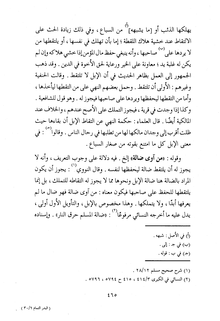 يهلكها الذئب أو [ما يشبهه] (أ) ثم من السباع، وفي ذلك زيادة الحث على الالتقاط عند خشية هلاك اللقطة؛ إما بأن تهلك في نفسها، أو يلتقطها من لا يردها على (ب) صاحبها، وأنه ينبغي حفظ مال المؤمن إذا خشي هلاكه وإن لم يكن له غلبة يد؛ معاونة على الخير ورعاية لحق الأخوة في الدين. وقد ذهب الجمهور إلى العمل بظاهر الحديث في أن الإبل لا تلتقط. وقالت الحنفية وغيرهم: الأولى أن تلتقط. وحمل بعضهم النهي على من التقطها ليأخذها، وأما من التقطها ليحفظها ويردها على صاحبها فيجوز له. وهو قول للشافعية. وكذا إذا وجدت في قرية، فيجوز التملك على الأصح عندهم، والخلاف عند المالكية أيضًا. قال العلماء: حكمة النهي عن التقاط الإبل أن بقاءها حيث ظلت أقرب إلى وجدان مالكها لها من تطلبها في رحال الناس. وقالوا (جـ): في معنى الإبل كل ما امتنع بقوته من صغار السباع.