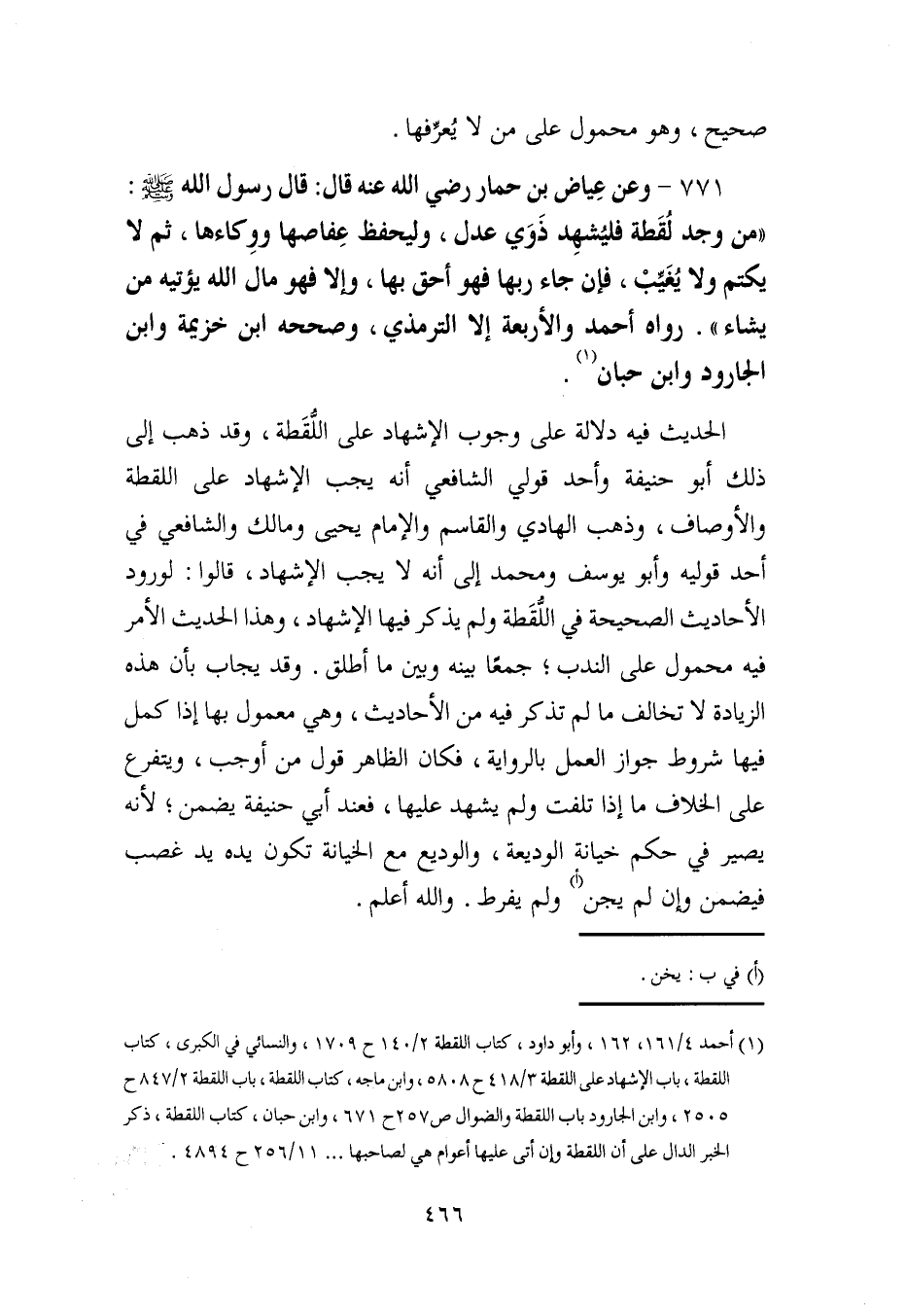 771 - وعن عِياض بن حمار رضي الله عنه قال: قال رسول الله - صلى الله عليه وسلم -: "من وجد لُقَطة فليُشهِد ذَوَي عدل، وليحفظ عِفاصها ووكاءها، ثم لا يكتم ولا يُغَيِّبْ، فإن جاء ربها فهو أحق بها، وإلا فهو مال الله يؤتيه من يشاء". رواه أحمد والأربعة إلا الترمذي، وصححه ابن خزيمة وابن الجارود وابن حبان (¬1).