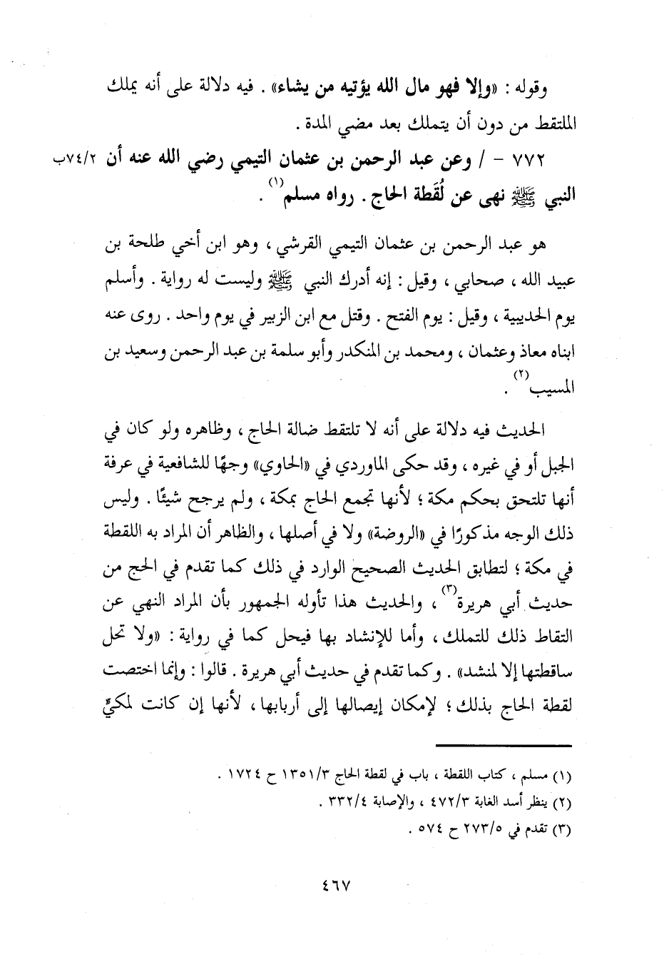 772 - وعن عبد الرحمن بن عثمان التيمي رضي الله عنه أن النبي - صلى الله عليه وسلم - نهى عن لُقَطة الحاج. رواه مسلم (¬1).