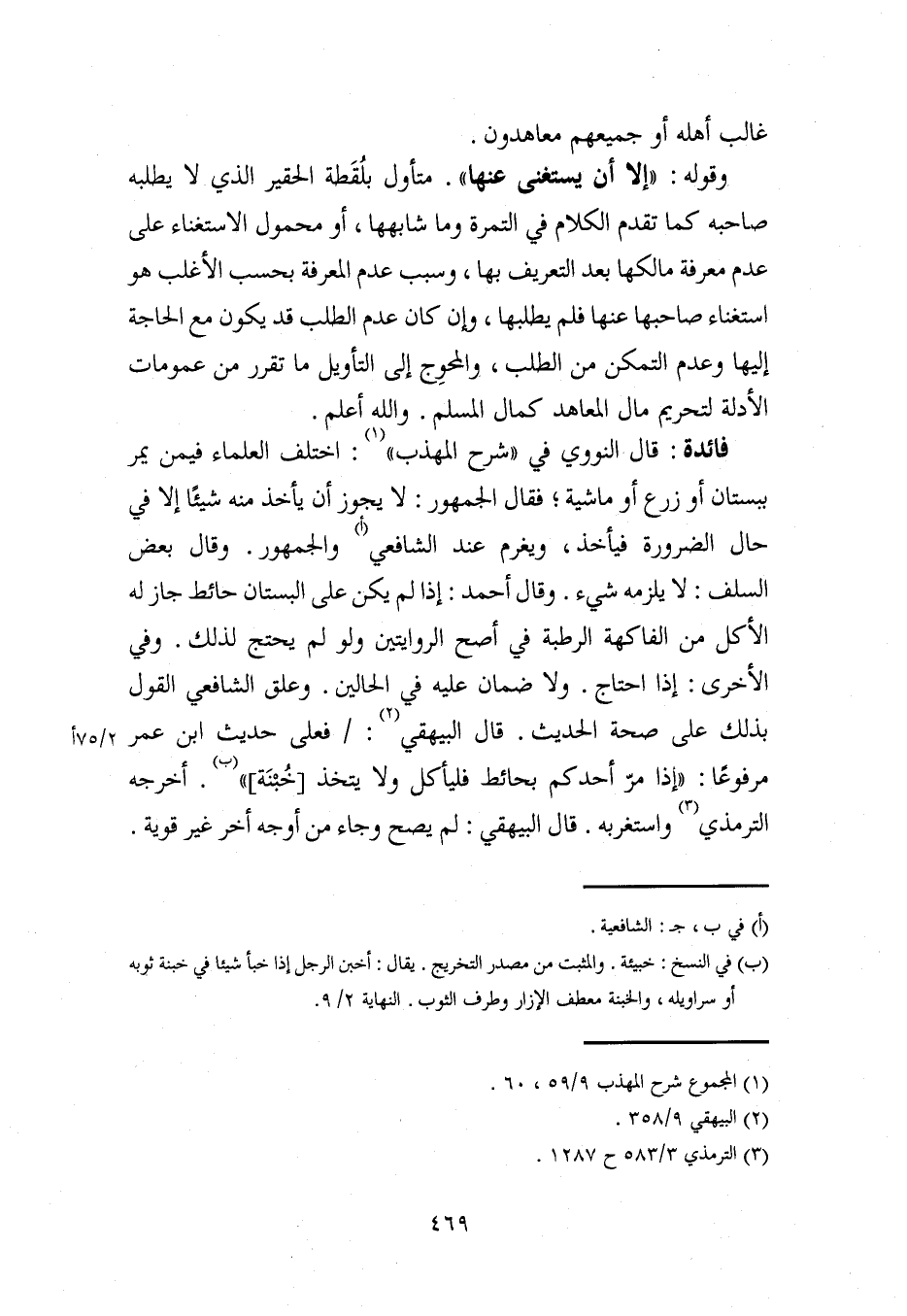 فائدة: قال النووي في "شرح المهذب" (¬1): اختلف العلماء فيمن يمر ببستان أو زرع أو ماشية؛ فقال الجمهور: لا يجوز أن يأخذ منه شيئًا إلا في حال الضرورة فيأخذ، ويغرم عند الشافعي (ح) والجمهور. وقال بعض السلف: لا يلزمه شيء. وقال أحمد: إذا لم يكن على البستان حائط جاز له الأكل من الفاكهة الرطبة في أصح الروايتين ولو لم يحتج لذلك. وفي الأخرى: إذا احتاج. ولا ضمان عليه في الحالين. وعلق الشافعي القول بذلك على صحة الحديث. قال البيهقي (¬2): فعلى حديث ابن عمر مرفوعًا: "إذا مرّ أحدكم بحائط فليأكل ولا يتخذ [خُبنَة] " (ب). أخرجه الترمذي (¬3) واستغربه. قال البيهقي: لم يصح وجاء من أوجه أخر غير قوية.