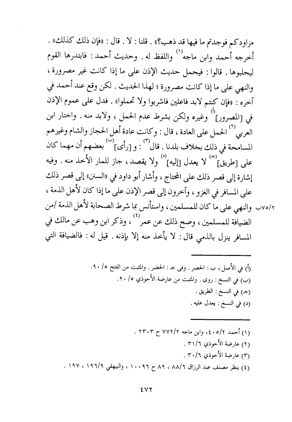 أخرجه أحمد وابن ماجة (¬1) واللفظ له. وحديث أحمد: فابتدرها القوم ليحلبوها. قالوا: فيحمل حديث الإذن على ما إذا كانت غير مصرورة، والنهي على ما إذا كانت مصرورة، لهذا الحديث. لكن وقع عند أحمد في آخره: "فإن كنتم لا بد فاعلين فاشربوا ولا تحملوا". فدل على عموم الإذن في [المصرور] (أ) وغيره ولكن بشرط عدم الحمل، ولابد منه. واختار ابن العربي (¬2) الحمل على العادة، قال: وكانت عادة أهل الحجاز والشام وغيرهم المسامحة في ذلك بخلاف بلدنا. قال (¬3): و [رأى] (ب) بعضهم أن مهما كان على [طريق] (جـ) لا يعدل [إليه] (د) ولا يقصد، جاز للمار الأخذ منه. وفيه إشارة إلى قصر ذلك على المحتاج، وأشار أبو داود في "السنن" إلى قصر ذلك على المسافر في الغزو، وآخرون إلى قصر الإذن على ما إذا كان لأهل الذمة، والنهي على ما كان للمسلمين، واستأنس بما شرط الصحابة لأهل الذمة من الضيافة للمسلمين، وصح ذلك عن عمر (¬4)، وذكر ابن وهب عن مالك في المسافر ينزل بالذمي قال: لا يأخذ منه إلا بإذنه. قيل له: فالضيافة التي