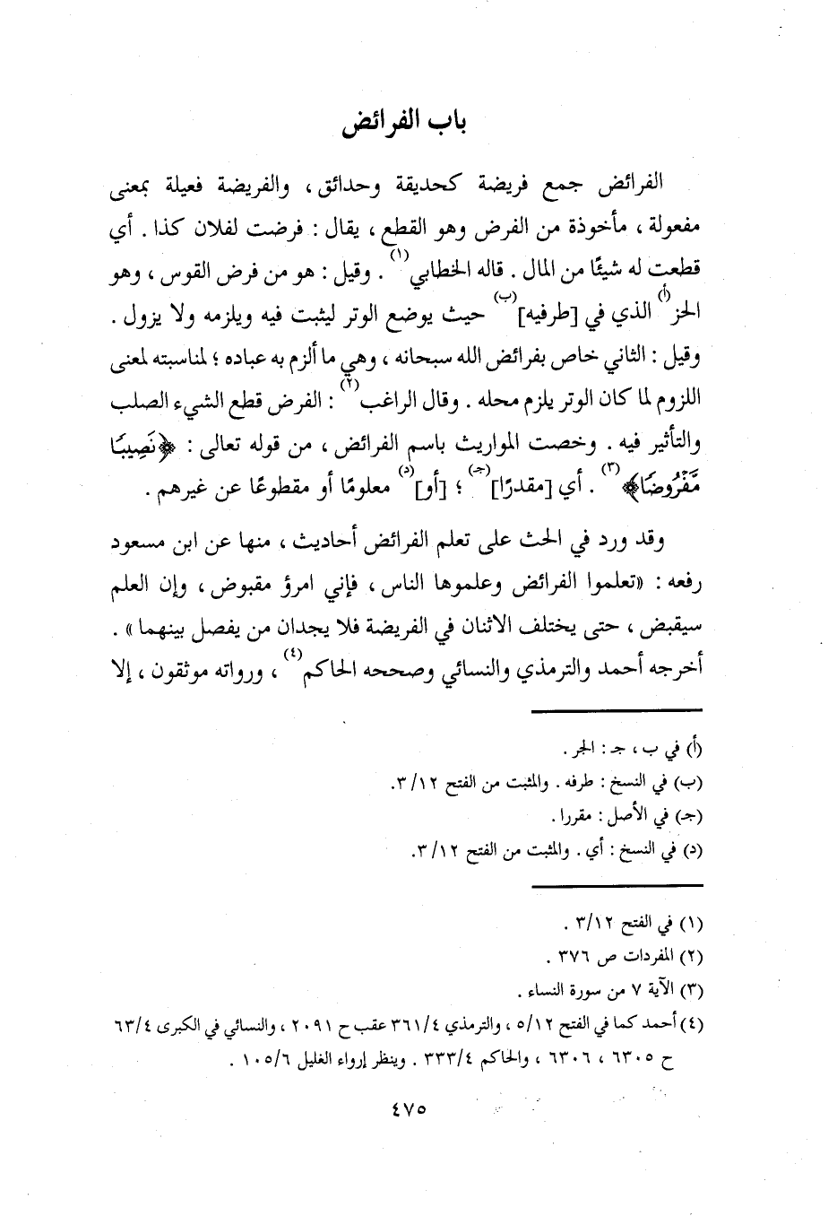 الفرائض جمع فريضة كحديقة وحدائق، والفريضة فعيلة بمعنى مفعولة، مأخوذة من الفرض وهو القطع، يقال: فرضت لفلان كذا. أي قطعت له شيئًا من المال. قاله الخطابي (¬1). وقيل: هو من فرض القوس، وهو الحز (أ) الَّذي في [طرفيه] (5) حيث يوضع الوتر ليثبت فيه ويلزمه ولا يزول. وقيل: الثاني خاص بفرائض الله سبحانه، وهي ما ألزم به عباده؛ لمناسبته لمعنى اللزوم لما كان الوتر يلزم محله. وقال الراغب (¬2): الفرض قطع الشيء الصلب والتأثير فيه. وخصت المواريث باسم الفرائض، من قوله تعالى: {نَصِيْبًا مَّفْرُوضًا} (¬3). أي {مقدرًا} (جـ)؛ [أو] (د) معلومًا أو مقطوعًا عن غيرهم.