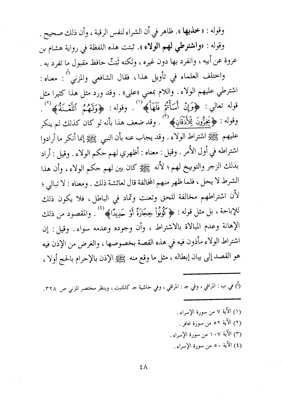 واختلف العلماء في تأويل هذا، فقال الشافعي والمزني (أ): معناه: اشترطي عليهم الولاء. واللام بمعنى "على". وقد ورد مثل هذا كثيرا مثل قوله تعالى: {وَإِنْ أَسَأْتُمْ فَلَهَا} (¬1). وقوله: {وَلَهُمُ اللَّعْنَةُ} (¬2). وقوله: {وَيَخِرُّونَ لِلْأَذْقَانِ} (¬3). وقد ضعف هذا بأنه لو كان كذلك لم ينكر عليهم - صلى الله عليه وسلم - اشتراط الولاء. وقد يجاب عنه بأن النبي - صلى الله عليه وسلم - إنما أنكر ما أرادوا اشتراطه في أول الأمر. وقيل: معناه: أظهري لهم حكم الولاء. وقيل: أراد بذلك الزجر والتوبيخ لهم؛ لأنه - صلى الله عليه وسلم - كان بين لهم حكم الولاء، وأن هذا الشرط لا يحل، فلما ظهر منهم المخالفة قال لعائشة ذلك. ومعناه: لا تبالي، لأن اشتراطهم مخالفة للحق وتعنت وتماد في الباطل، فلا يكون ذلك للإهانة، بل مثل قوله: {كُونُوا حِجَارَةً أَوْ حَدِيدًا} (¬4). والمقصود من ذلك الإهانة وعدم المبالاة بالاشتراط، وأن وجوده وعدمه سواء. وقيل: إن اشتراط الولاء مأذون فيه في هذه القصة بخصوصها، والغرض من الإذن فيه هو القصد إلى بيان إبطاله، مثل ما وقع منه - صلى الله عليه وسلم - الإذن بالإحرام بالحج أولًا،
