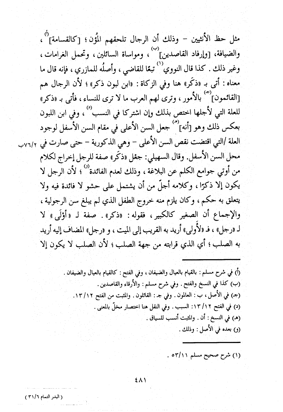 مثل حظ الأنثيين- وذلك أن الرجال تلحقهم المُؤُن؛ [كالقسامة] (أ)، والضيافة، [وإرفاد القاصدين] (ب)، ومواساة السائلين، وتحمل الغرامات، وغير ذلك. كذا قال النووي (¬1) تبعًا للقاضي، وأصلُه للمازري، فإنه قال ما معناه: أتى بـ "ذكَر" هنا وفي الزكاة: "ابن لبون ذكر"؛ لأن الرجال هم [القائمون] (جـ) بالأمور، وترى لهم العرب ما لا ترى للنساء، فأتى بـ "ذكر" للعلة التي لأجلها اختص بذلك وإن اشتركا في النسب (د)، وفي ابن اللبون بعكس ذلك وهو [أنه] (هـ) جعل السن الأعلى في مقام السن الأسفل لوجود العلة لم التي اقتضت نقص السن الأعلى -وهي الذكورية- حتَّى صارت في محل السن الأسفل. وقال السهيلي: جعْل "ذكَر" صفة للرجل إخراج لكلام من أوتي جوامع الكلم عن البلاغة، وذلك لعدم الفائدة (و)؛ لأن الرجل لا يكون إلا ذكرًا، وكلامه أجلّ من أن يشتمل على حشو لا فائدة فيه ولا يتعلق به حكم، وكان يلزم منه خروج الطفل الَّذي لم يبلغ سن الرجولية، والإجماع أن الصغير كالكبير، فقوله: "ذكر". صفة لـ " أوْلَى" لا لـ "رجل"، فـ "لأَولى" أريد به القريب إلى الميت، و"رجل" المضاف إليه أريد به الصلب؛ أي الَّذي قرابته من جهة الصلب؛ لأن الصلب لا يكون إلا