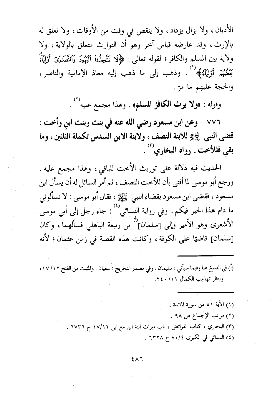 776 - وعن ابن مسعود رضي الله عنه في بنت وبنت ابنن وأخت: قضى النبي - صلى الله عليه وسلم - للابنة النصف، ولابنة الابن السدس تكملة الثلثين، وما بقي فللأخت. رواه البخاري (¬3).