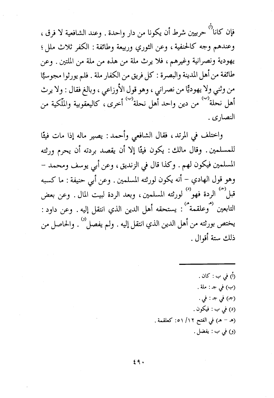 واختلف في المرتد، فقال الشافعي وأحمد: يصير ماله إذا مات فيئًا للمسلمين. وقال مالك: يكون فيئًا إلا أن يقصد بردته أن يحرم ورثته المسلمين فيكون لهم. وكذا قال في الزنديق، وعن أبي يوسف ومحمد - وهو قول الهادي - أنَّه يكون لورثته المسلمين. وعن أبي حنيفة: ما كسبه قبل (جـ) الردة فهو (د) لورثته المسلمين، وبعد الردة لبيت المال. وعن بعض التابعين (هـ وعلقمة هـ): يستحقه أهل الدين الَّذي انتقل إليه. وعن داود: يختص بورثته من أهل الدين الَّذي انتقل إليه. ولم يفصل (و) والحاصل من ذلك ستة أقوال.