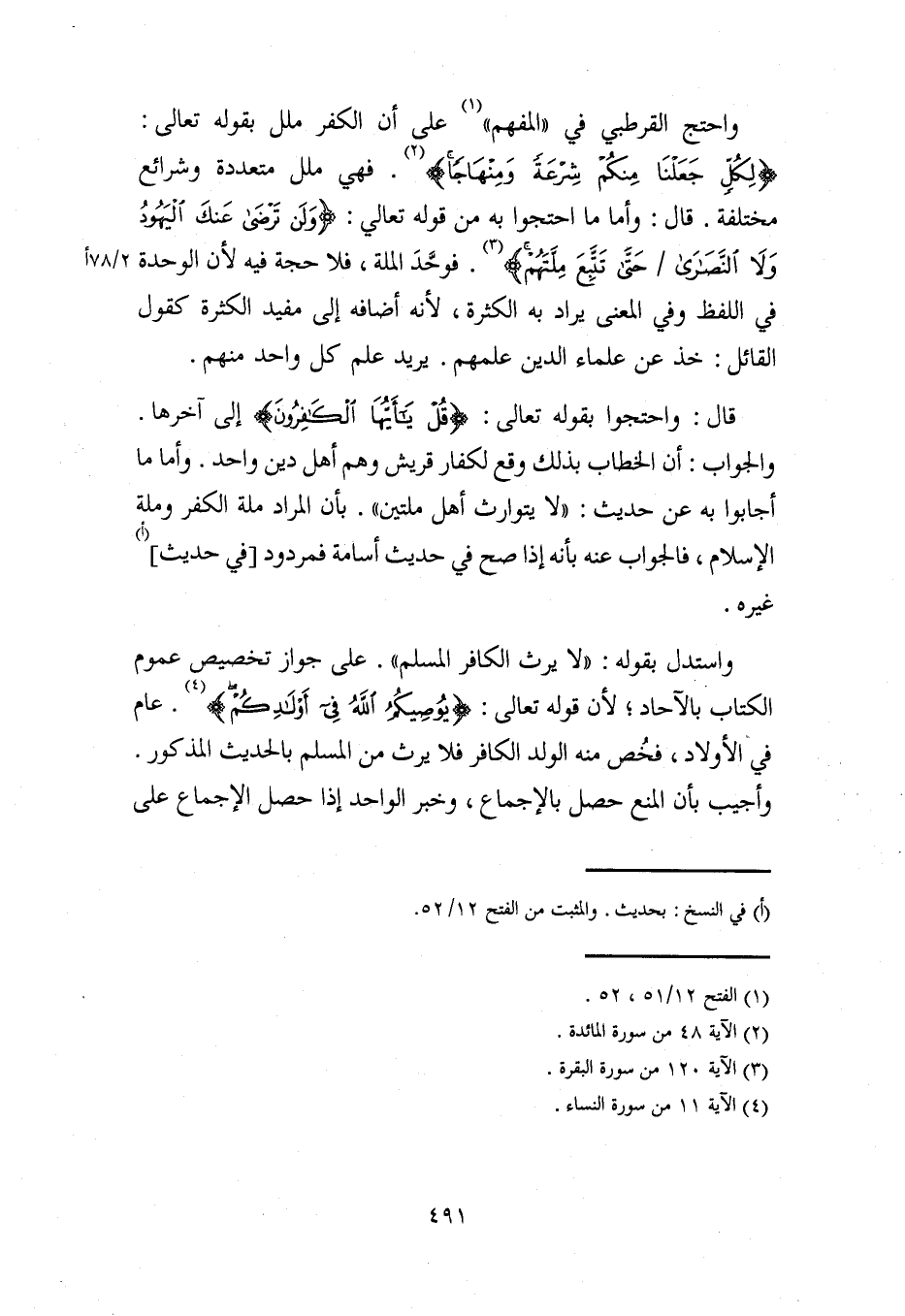 واحتج القرطبي في "المفهم" (¬1) على أن الكفر ملل بقوله تعالى: {لِكُلٍّ جَعَلْنَا مِنْكُمْ شِرْعَةً وَمِنْهَاجًا} (¬2). فهي ملل متعددة وشرائع مختلفُة. قال: وأما ما احتجوا به من قوله تعالى: {وَلَنْ تَرْضَى عَنْكَ الْيَهُودُ وَلَا النَّصَارَى حَتَّى تَتَّبِعَ مِلَّتَهُمْ} (¬3). فوحَّدَ الملة، فلا حجة فيه لأن الموحدة في اللفظ وفي المعنى يراد به الكثرة، لأنه أضافه إلى مفيد الكثرة كقول القائل: خذ عن علماء الدين علمهم. يريد علم كل واحد منهم.