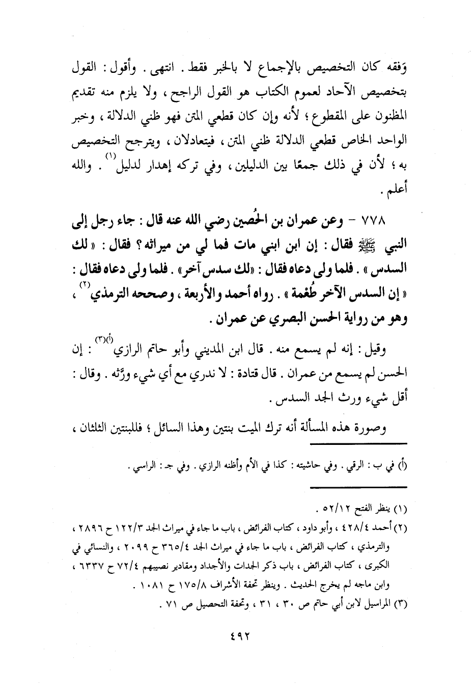 778 - وعن عمران بن الحُصين رضي الله عنه قال: جاء رجل إلى النبي - صلى الله عليه وسلم - فقال: إن ابن ابني مات فما لي من ميراثه؟ فقال: "لك السدس". فلما ولى دعاه فقال: "لك سدس آخر". فلما ولى دعاه فقال: "إن السدس الآخر طُعْمة". رواه أحمد والأربعة، وصححه الترمذي (¬2)، وهو من رواية الحسن البصري عن عمران.