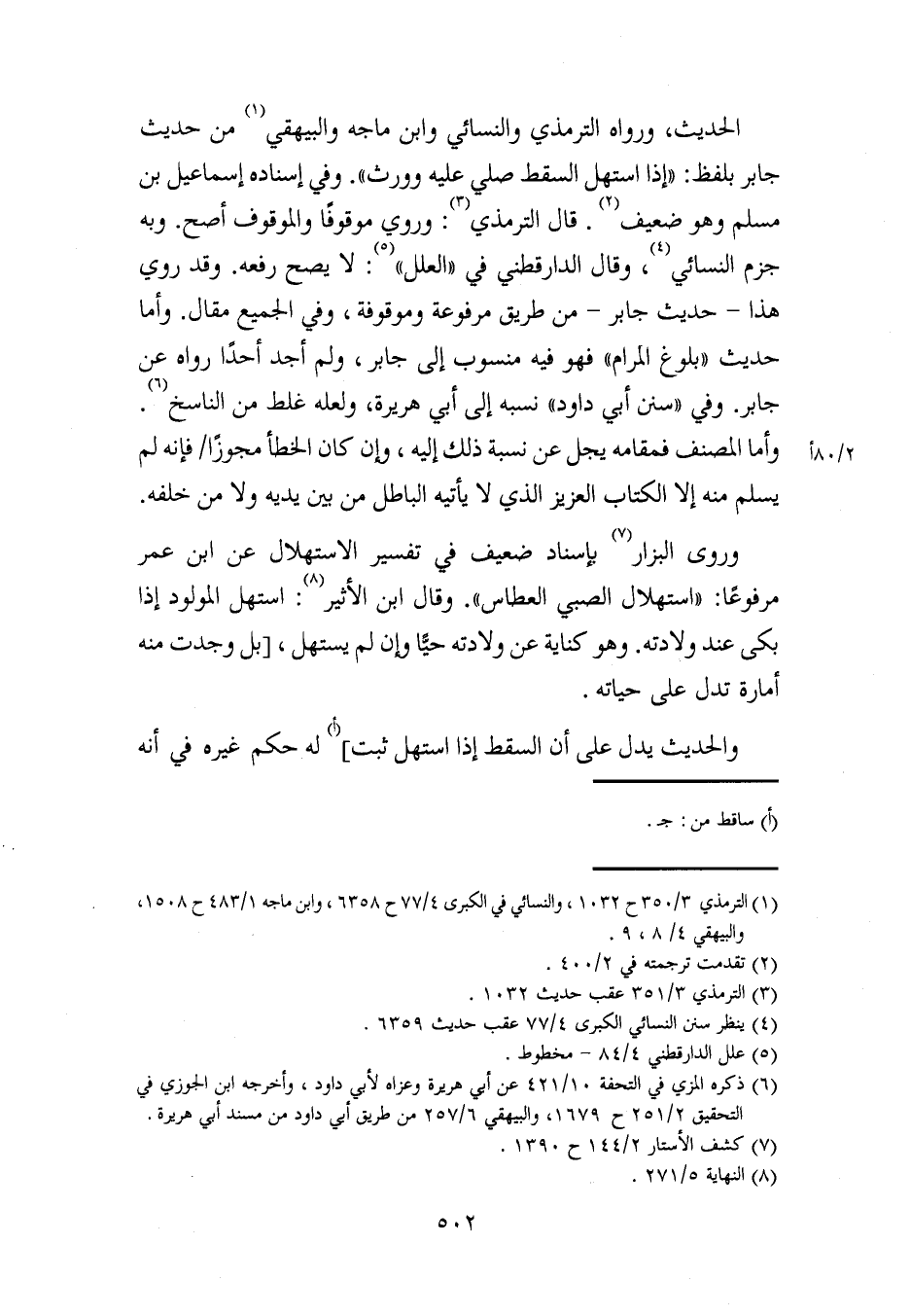 الحديث، ورواه الترمذي والنسائي وابن ماجة والبيهقي (¬1) من حديث جابر بلفظ: "إذا استهل السقط صلي عليه وورث". وفي إسناده إسماعيل بن مسلم وهو ضعيف (¬2). قال الترمذي (¬3): وروي موقوفًا والموقوف أصح. وبه جزم النسائي (¬4)، وقال الدارقطني في "العلل" (¬5): لا يصح رفعه. وقد روي هذا -حديث جابر- من طريق مرفوعة وموقوفة، وفي الجميع مقال. وأما حديث "بلوغ المرام" فهو فيه منسوب إلى جابر، ولم أجد أحدًا رواه عن جابر. وفي "سنن أبي داود" نسبه إلى أبي هريرة، ولعله غلط من الناسخ (¬6). وأما المصنف فمقامه يجل عن نسبة ذلك إليه، وإن كان الخطأ مجوزًا فإنه يسلم منه إلا الكتاب العزيز الَّذي لا يأتيه الباطل من بين يديه ولا من خلفه.