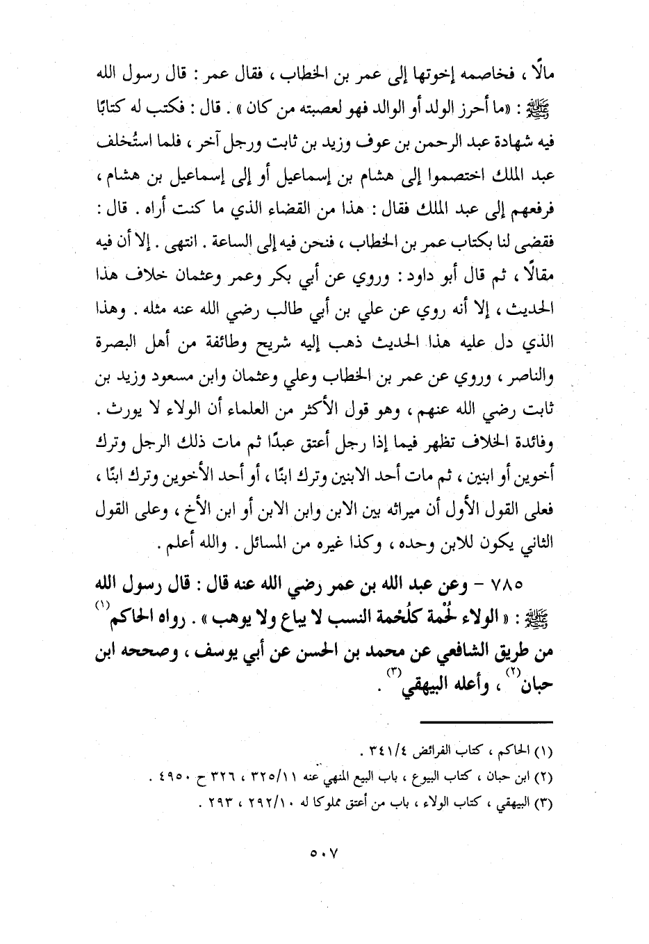 785 - وعن عبد الله بن عمر رضي الله عنه قال: قال رسول الله - صلى الله عليه وسلم -: "الولاء لُحْمة كلُحْمة النسب لا يباع ولا يوهب". رواه الحاكم (¬1) من طريق الشافعي عن محمد بن الحسن عن أبي يوسف، وصححه ابن حبان (¬2)، وأعله البيهقي (¬3).