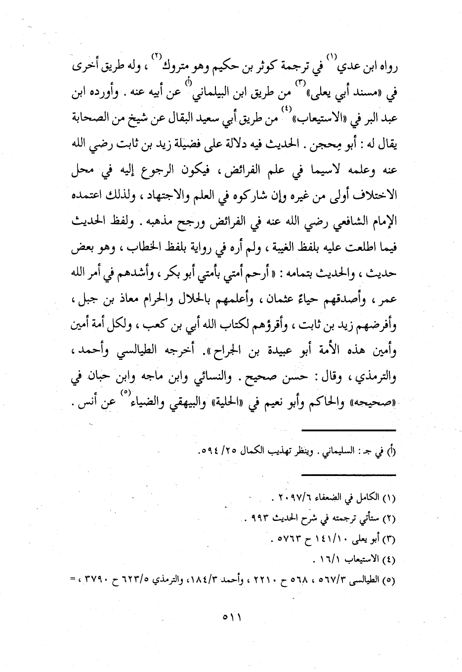 رواه ابن عدي (¬1) في ترجمة كوثر بن حكيم وهو متروك (¬2)، وله طريق أخرى في "مسند أبي يعلى" (¬3) من طريق ابن البيلماني (أ) عن أبيه عنه. وأورده ابن عبد البر في "الاستيعاب" (¬4) من طريق أبي سعيد البقال عن شيخ من الصحابة يقال له: أبو مِحجن. الحديث فيه دلالة على فضيلة زيد بن ثابت رضي الله عنه وعلمه لا سيما في علم الفرائض، فيكون الرجوع إليه في محل الاختلاف أولى من غيره وإن شاركوه في العلم والاجتهاد، ولذلك اعتمده الإمام الشافعي رضي الله عنه في الفرائض ورجح مذهبه. ولفظ الحديث فيما اطلعت عليه بلفظ الغيبة، ولم أره في رواية بلفظ الخطاب، وهو بعض حديث، والحديث بتمامه: "أرحم أمتي بأمتي أبو بكر، وأشدهم في أمر الله عمر، وأصدقهم حياءً عثمان، وأعلمهم بالحلال والحرام معاذ بن جبل، وأفرضهم زيد بن ثابت، وأقرؤهم لكتاب الله أبي بن كعب، ولكل أمة أمين وأمين هذه الأمة أبو عبيدة بن الجراح". أخرجه الطالسي وأحمد، والترمذي، وقال: حسن صحيح. والنسائي وابن ماجه وابن حبان في "صحيحه" والحاكم وأبو نعيم في "الحلية" والبيهقي والضياء (¬5) عن أنس.
