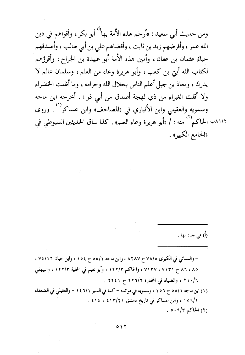ومن حديث أبي سعيد: "أرحم هذه الأمة بها (أ) أبو بكر، وأقواهم في دين الله عمر، وأفرضهم زيد بن ثابت، وأقضاهم علي بن أبي طالب، وأصدقهم حياءً عثمان بن عفان، وأمين هذه الأمة أبو عبيدة بن الجراح، وأقرؤهم لكتاب الله أبيّ بن كعب، وأبو هريرة وعاء من العلم، وسلمان عالم لا يدرك، ومعاذ بن جبل أعلم الناس بحلال الله وحرامه، وما أظلت الخضراء ولا أقلت الغبراء من ذي لهجة أصدق من أبي ذر". أخرجه ابن ماجه وسمويه والعقيلي وابن الأنباري في "المصاحف" وابن عساكر (¬1). وروى الحاكم (¬2) منه: "أبو هريرة وعاء العلم". كذا ساق الحديثين السيوطي في "الجامع الكبير".