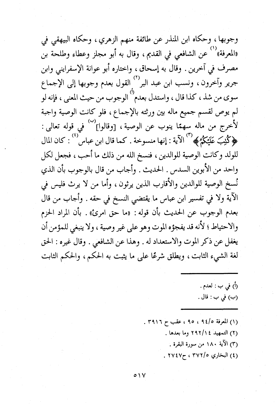 وجوبها، وحكاه ابن المنذر عن طائفة منهم الزهري، وحكاه البيهقي في "المعرفة" (¬1) عن الشافعي في القديم، وقال به أبو مجلز وعطاء وطلحة بن مصرف في آخرين. وقال به إسحاق، واختاره أبو عوانة الإسفرايني وابن جرير وآخرون، ونسب ابن عبد البر (¬2) القول بعدم وجوبها إلى الإجماع سوى من شذ، كذا قال، واستدل بعدم (أ) الوجوب من حيث المعنى، فإنه لو لم يوص لقسم جميع ماله بين ورثته بالإجماع، فلو كانت الوصية واجبة لأخرج من ماله سهمًا ينوب عن الوصية، [وقالوا] (ب) في قوله تعالى: {كُتِبَ عَلَيْكُمُ} (¬3) الآية: إنها منسوخة. كما قال ابن عباس (¬4): كان المال للولد وكانت الوصية للوالدين، فنسخ الله من ذلك ما أحب، فجعل لكل واحد من الأبوين السدس. الحديث. وأجاب من قال بالوجوب بأن الذي نُسخ الوصية للوالدين والأقارب الذين يرثون، وأما من لا يرث فليس في الآية ولا في تفسير ابن عباس ما يقتضي النسخ في حقه. وأجاب من قال بعدم الوجوب عن الحديث بأن قوله: "ما حق امرئ". بأن المراد الحزم والاحتياط، لأنه قد يفجؤه الموت وهو على غير وصية، ولا ينبغي للمؤمن أن يغفل عن ذكر الموت والاستعداد له. وهذا عن الشافعي. وقال غيره: الحق لغة الشيء الثابت، ويطلق شرعًا على ما يثبت به الحكم، والحكم الثابت