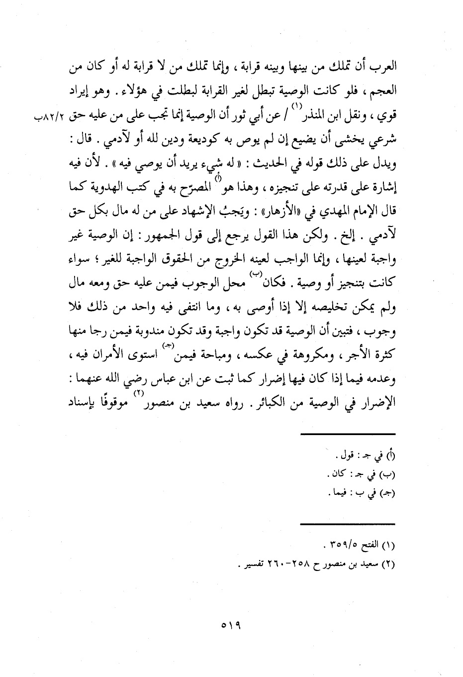 العرب أن تملك من بينها وبينه قرابة، وإنما تملك من لا قرابة له أو كان من العجم، فلو كانت الوصية تبطل لغير القرابة لبطلت في هؤلاء. وهو إيراد قوي، ونقل ابن المنذر (¬1) عن أبي ثورأن الوصية إنما تجب على من عليه حق شرعي يخشى أن يضيع إن لم يوص به كوديعة ودين لله أو لآدمي. قال: ويدل على ذلك قوله في الحديث: "له شيء يريد أن يوصي فيه". لأن فيه إشارة على قدرته على تنجيزه، وهذا هو (أ) المصرح به في كتب الهدوية كما قال الإمام المهدي في "الأزهار": ويَجبُ الإشهاد على من له مال بكل حق لآدمي. إلخ. ولكن هذا القول يرجع إلى قول الجمهور: إن الوصية غير واجبة لعينها، وإنما الواجب لعينه الخروج من الحقوق الواجبة للغير، سواء كانت بتنجيز أو وصية. فكان (ب) محل الوجوب فيمن عليه حق ومعه مال ولم يمكن تخليصه إلا إذا أوصى به، وما انتفى فيه واحد من ذلك فلا وجوب، فتبين أن الوصية قد تكون واجبة وقد تكون مندوبة فيمن رجا منها كثرة الأجر، ومكروهة في عكسه، ومباحة فيمن (جـ) استوى الأمران فيه، وعدمه فيما إذا كان فيها إضرار كما ثبت عن ابن عباس رضي الله عنهما: الإضرار في الوصية من الكبائر. رواه سعيد بن منصور (¬2) موقوفًا بإسناد