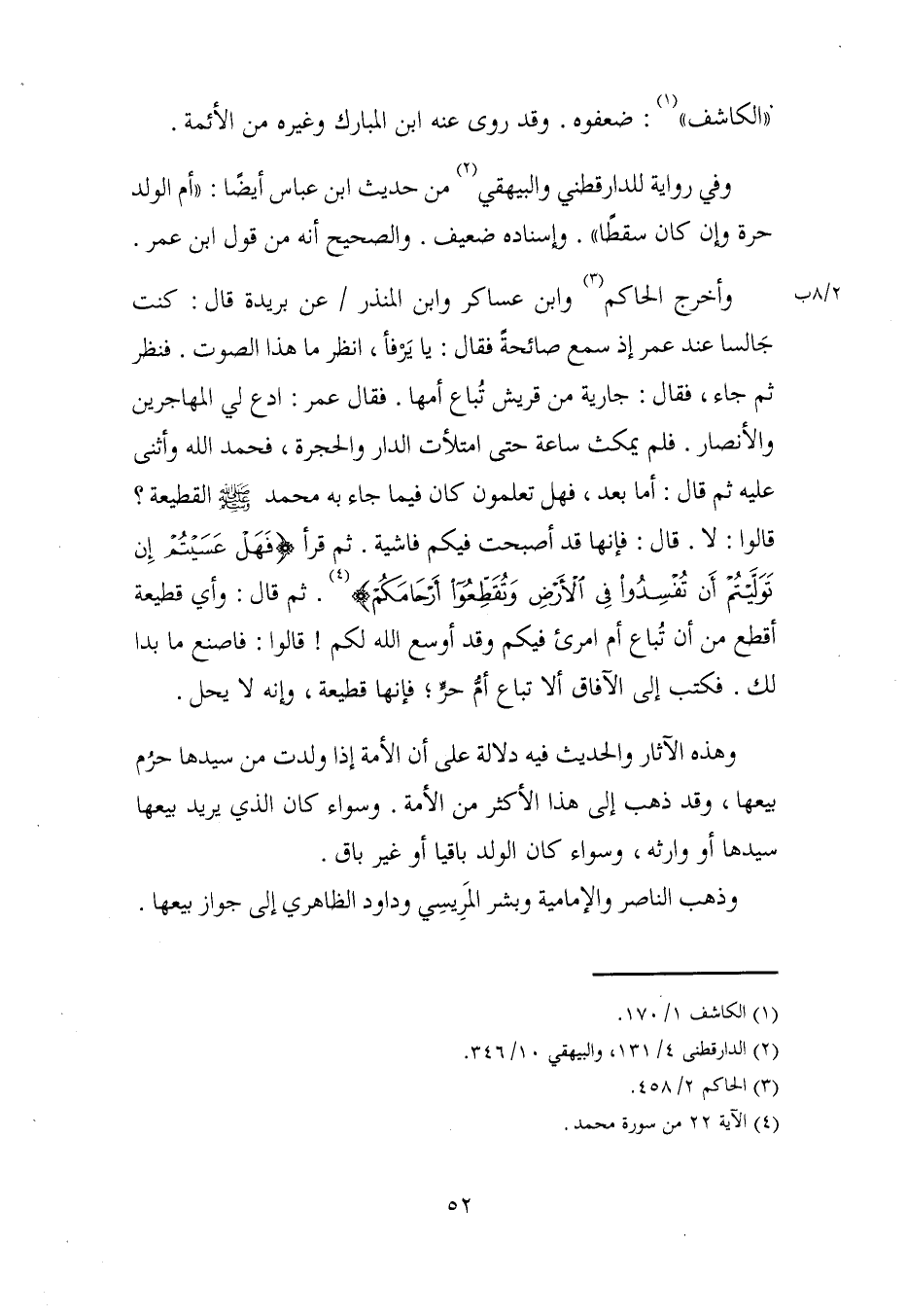 وأخرج الحاكم (¬3) وابن عساكر وابن المنذر عن بريدة قال: كنت جَالسا عند عمر إذ سمع صائحةً فقال: يا يَرْفأ، انظر ما هذا الصوت. فنظر ثم جاء، فقال: جارية من قريش تُباع أمها. فقال عمر: ادع لي المهاجرين والأنصار. فلم يمكث ساعة حتى امتلأت الدار والحجرة، فحمد الله وأثنى عليه ثم قال: أما بعد، فهل تعلمون كان فيما جاء به محمد - صلى الله عليه وسلم - القطيعة؟ قالوا: لا. قال: فإنها قد أصبحت فيكم فاشية. ثم قرأ {فَهَلْ عَسَيْتُمْ إِنْ تَوَلَّيْتُمْ أَنْ تُفْسِدُوا فِي الْأَرْضِ وَتُقَطِّعُوا أَرْحَامَكُمْ} (¬4). ثم قال: وأي قطيعة أقطع من أن تُباع أم امرئ فيكم وقد أوسع الله لكم! قالوا: فاصنع ما لدا لك. فكتب إلى الآفاق ألا تباع أمُّ حرٍّ؛ فإنها قطيعة، وإنه لا يحل.