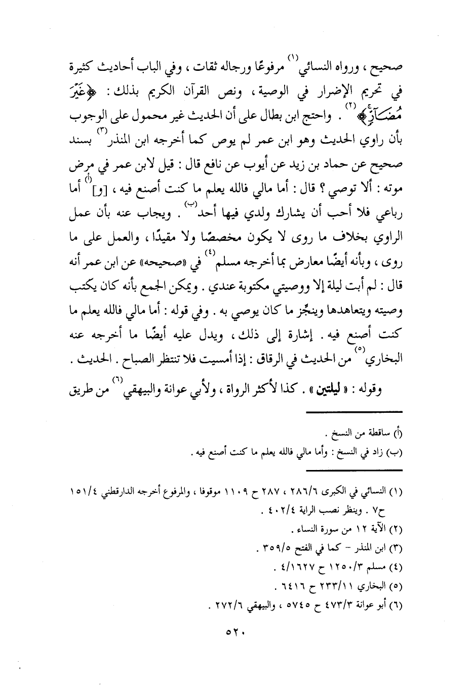 صحيح، ورواه النسائي (¬1) مرفوعًا ورجاله ثقات، وفي الباب أحاديث كثيرة في تحريم الإضرار في الوصية، ونص القرآن الكريم بذلك: {غَيْرَ مُضَارٍّ} (¬2). واحتج ابن بطال على أن الحديث غير محمول على الوجوب بأن راوي الحديث وهو ابن عمر لم يوص كما أخرجه ابن المنذر (¬3) بسند صحيح عن حماد بن زيد عن أيوب عن نافع قال: قيل لابن عمر في مرض موته: ألا توصي؟ قال: أما مالي فالله يعلم ما كنت أصنع فيه، [و] (أ) أما رباعي فلا أحب أن يشارك ولدي فيها أحد (ب). ويجاب عنه بأن عمل الراوي بخلاف ما روى لا يكون مخصصًا ولا مقيدًا، والعمل على ما روى، وبأنه أيضًا معارض بما أخرجه مسلم (¬4) في "صحيحه" عن ابن عمر أنه قال: لم أبت ليلة إلا ووصيتي مكتوبة عندي. ويمكن الجمع بأنه كان يكتب وصيته ويتعاهدها وينجِّز ما كان يوصي به. وفي قوله: أما مالي فالله يعلم ما كنت أصنع فيه. إشارة إلى ذلك، ويدل عليه أيضًا ما أخرجه عنه البخاري (¬5) من الحديث في الرقاق: إذا أمسيت فلا تنتظر الصباح. الحديث.