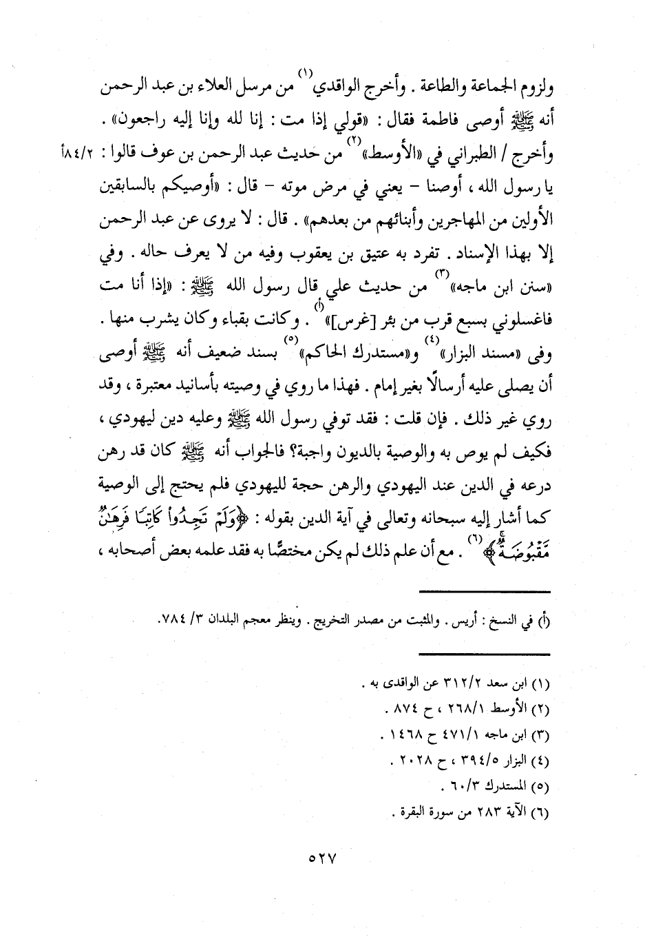 ولزوم الجماعة والطاعة. وأخرج الواقدي (¬1) من مرسل العلاء بن عبد الرحمن أنه - صلى الله عليه وسلم - أوصى فاطمة فقال: "قولي إذا مت: إنا لله وإنا إليه راجعون". وأخرج الطبراني في "الأوسط" (¬2) من حديث عبد الرحمن بن عوف قالوا: يا رسول الله، أوصنا -يعني في مرض موته- قال: "أوصيكم بالسابقين الأولين من المهاجرين وأبنائهم من بعدهم". قال: لا يروى عن عبد الرحمن إلا بهذا الإسناد. تفرد به عتيق بن يعقوب وفيه من لا يعرف حاله. وفي "سنن ابن ماجه" (¬3) من حديث علي قال رسول الله - صلى الله عليه وسلم -: "إذا أنا مت فاغسلوني بسبع قرب من بئر [غرس] " (أ). وكانت بقباء وكان يشرب منها. وفي "مسند البزار" (¬4) و"مستدرك الحاكم" (¬5) بسند ضعيف أنه - صلى الله عليه وسلم - أوصى أن يصلى عليه أرسالًا بغير إمام. فهذا ما روي في وصيته بأسانيد معتبرة، وقد روي غير ذلك. فإن قلت: فقد توفي رسول الله - صلى الله عليه وسلم - وعليه دين ليهودي، فكيف لم يوص به والوصية بالديون واجبة؟ فالجواب أنه - صلى الله عليه وسلم - كان قد رهن درعه في الدين عند اليهودي والرهن حجة لليهودي فلم يحتج إلى الوصية كما أشار إليه سبحانه وتعالى في آية الدين بقوله: {وَلَمْ تَجِدُوا كَاتِبًا فَرِهَانٌ مَقْبُوضَةٌ} (¬6). مع أن علم ذلك لم يكن مختصًّا به فقد علمه بعض أصحابه،