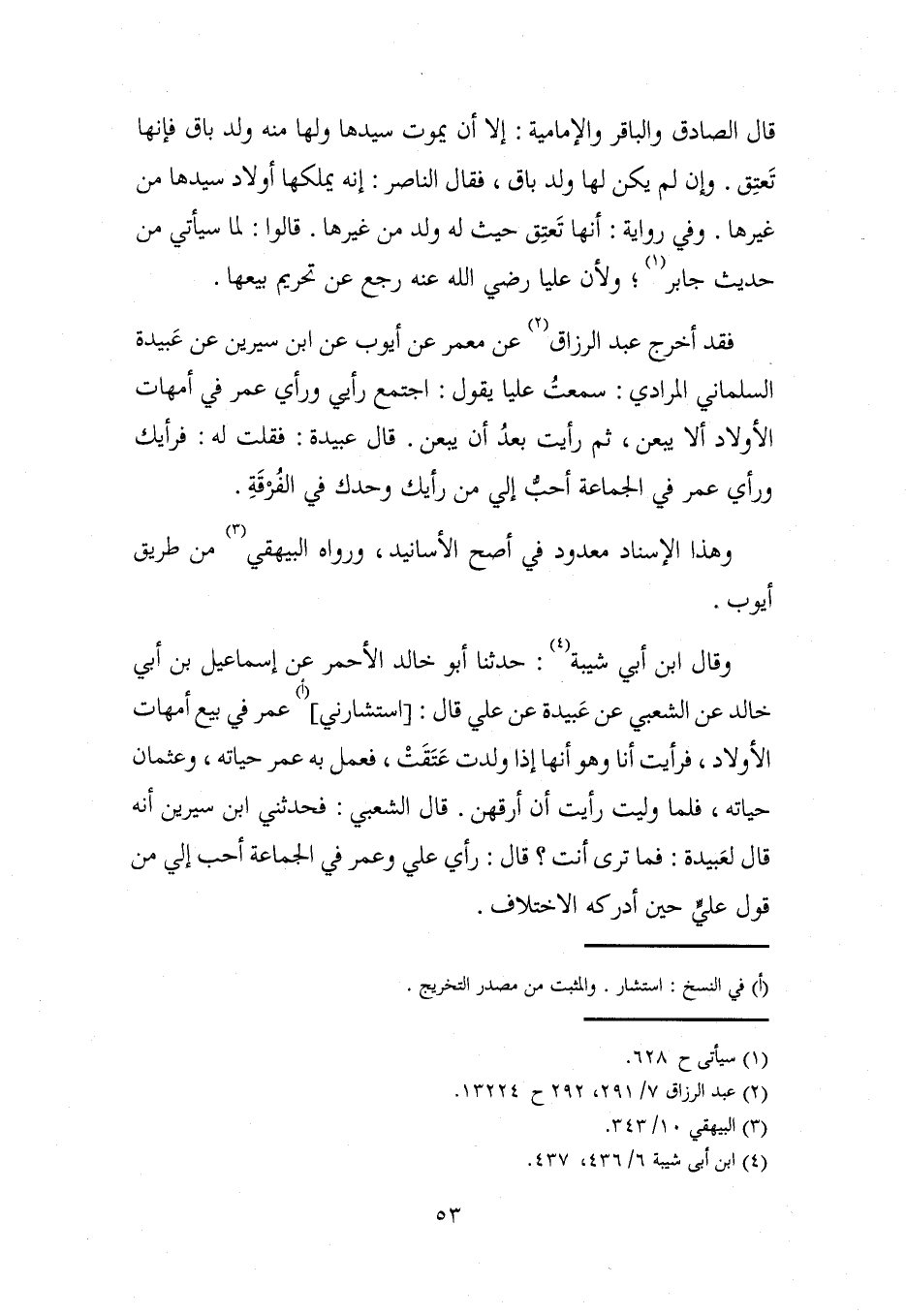 وقال ابن أبي شيبة (¬4): حدثنا أبو خالد الأحمر عن إسماعيل بن أبي خالد عن الشعبي عن عَبيدة عن علي قال: [استشارني] (أ) عمر في بيع أمهات الأولاد، فرأيت أنا وهو أنها إذا ولدت عَتَقَتْ، فعمل به عمر حياته، وعثمان حياته، فلما وليت رأيت أن أرقهن. قال الشعبي: فحدثني ابن سيرين أنه قال لعَبيدة: فما ترى أنت؟ قال: رأي علي وعمر في الجماعة أحب إلي من قول عليٍّ حين أدركه الاختلاف.