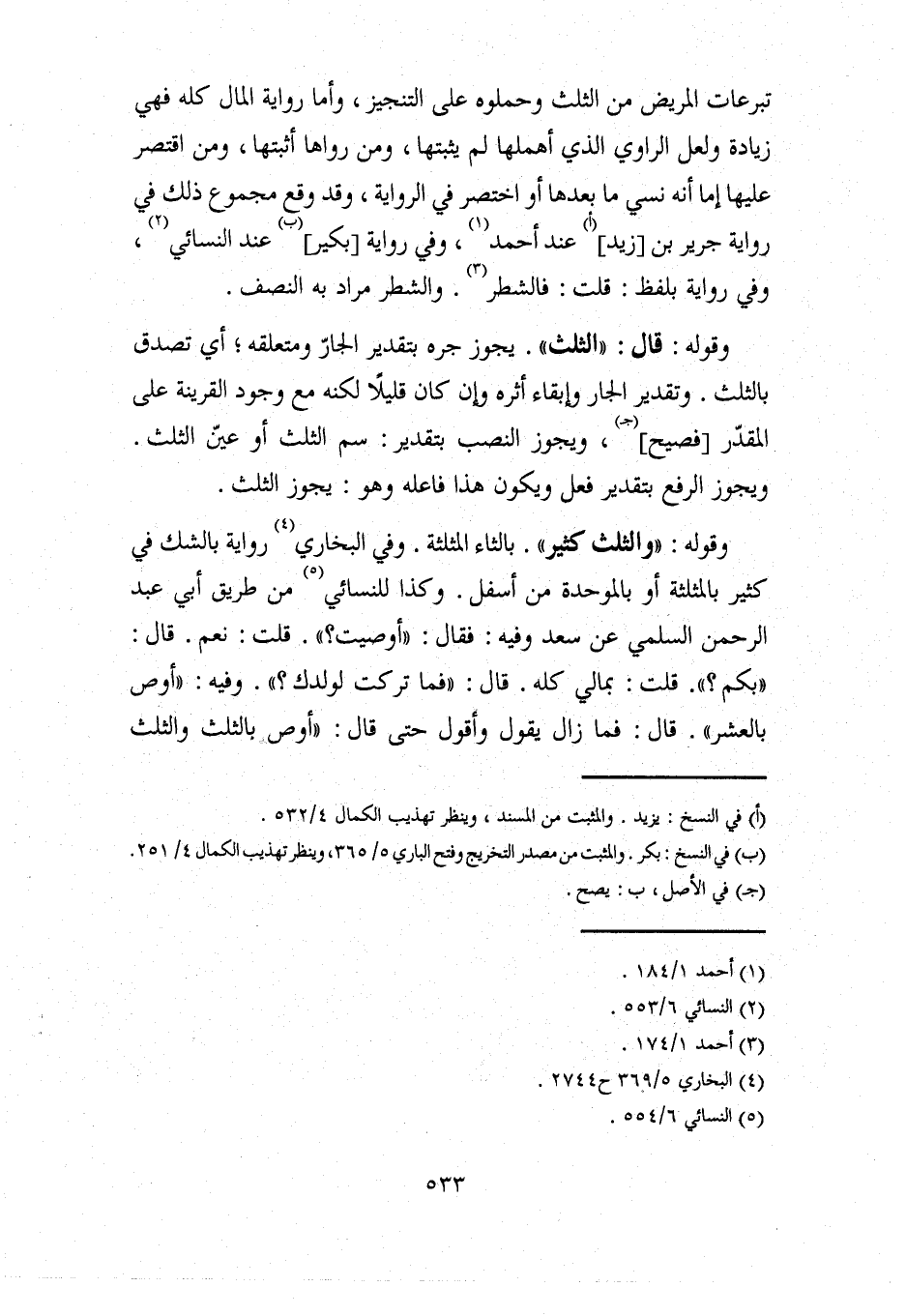 وقوله: قال: "الثلث". يجوز جره بتقدير الجارّ ومتعلقه؛ أي تصدق بالثلث. وتقدير الجار وإبقاء أثره وإن كان قليلًا لكنه مع وجود القرينة على المقدّر [فصيح] (جـ)، ويجوز النصب بتقدير: سم الثلث أو عينّ الثلث. ويجوز الرفع بتقدير فعل ويكون هذا فاعله وهو: يجوز الثلث.