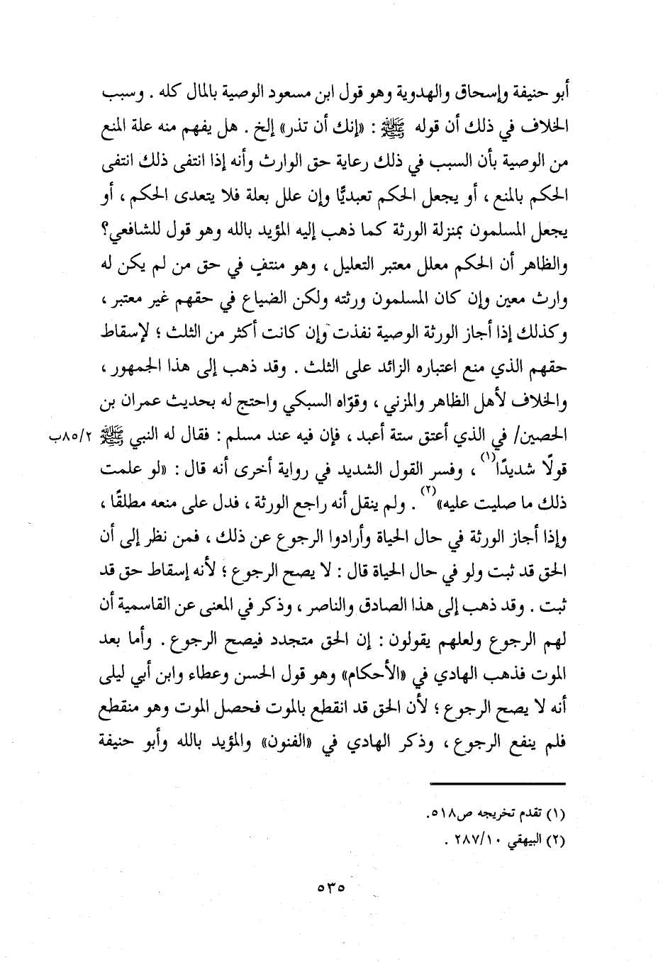 أبو حنيفة وإسحاق والهدوية وهو قول ابن مسعود الوصية بالمال كله. وسبب الخلاف في ذلك أن قوله - صلى الله عليه وسلم -: "إنك أن تذر" إلخ. هل يفهم منه علة المنع من الوصية بأن السبب في ذلك رعاية حق الوارث وأنه إذا انتفى ذلك انتفى الحكم بالمنع، أو يجعل الحكم تعبديًّا وإن علل بعلة فلا يتعدى الحكم، أو يجعل المسلمون بمنزلة الورثة كما ذهب إليه المؤيد بالله وهو قول للشافعي؟ والظاهر أن الحكم معلل معتبر التعليل، وهو منتفٍ في حق من لم يكن له وارث معين وإن كان المسلمون ورثته ولكن الضياع في حقهم غير معتبر، وكذلك إذا أجاز الورثة الوصية نفذت وإن كانت أكثر من الثلث؛ لإسقاط حقهم الذي منع اعتباره الزائد على الثلث. وقد ذهب إلى هذا الجمهور، والخلاف لأهل الظاهر والمزني، وقوّاه السبكي واحتج له بحديث عمران بن الحصين في الذي أعتق ستة أعبد، فإن فيه عند مسلم: فقال له النبي - صلى الله عليه وسلم - قولًا شديدًا (¬1)، وفسر القول الشديد في رواية أخرى أنه قال: "لو علمت ذلك ما صليت عليه" (¬2). ولم ينقل أنه راجع الورثة، فدل على منعه مطلقًا، وإذا أجاز الورثة في حال الحياة وأرادوا الرجوع عن ذلك، فمن نظر إلى أن الحق قد ثبت ولو في حال الحياة قال: لا يصح الرجوع؛ لأنه إسقاط حق قد ثبت. وقد ذهب إلى هذا الصادق والناصر، وذكر في المعنى عن القاسمية أن لهم الرجوع ولعلهم يقولون: إن الحق متجدد فيصح الرجوع. وأما بعد الموت فذهب الهادي في "الأحكام" وهو قول الحسن وعطاء وابن أبي ليلى أنه لا يصح الرجوع؛ لأن الحق قد انقطع بالموت فحصل الموت وهو منقطع فلم ينفع الرجوع، وذكر الهادي في "الفنون" والمؤيد بالله وأبو حنيفة
